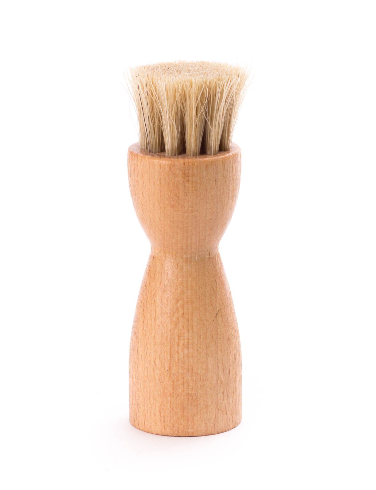 Eine Tiegelbürste mit Rosshaar die auch den Boden von Schuhcremetiegeln erreicht. Hergestellt in Deutschland aus heimischem Buchenholz.