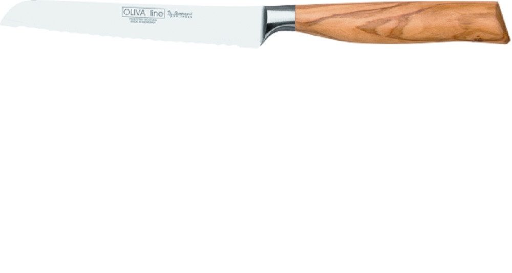 Die OLIVA line bietet Premiumqualität. Der ergonomisch geformte Griff aus hochwertigem Olivenholz kennzeichnet ihren besonderen Charakter. Das Brötchenmesser eignet sich hervorragend zum Aufschneiden von Brötchen oder zum Zerteilen von Baguette. Der Wellenschliff ermöglicht sauberes Schneiden ohne das Schneidgut zu zerquetschen. Die Klinge ist in Solingen geschmiedet und besteht aus hochwertigem, rostfreiem Stahl. Mit dem ergonomischen Griff aus feinstem Olivenholz liegt das Brötchenmesser ideal in der Hand. So macht das Schneiden und Verzieren von Obst und Gemüse noch mehr Spaß. Das zeitlose Design des Griffes ist auch optisch ein echter Hingucker, ob im Messerblock oder an der Magnetleiste sind die Messer der Oliva Line durch ihre einzigartige Maserung ein Eye-catcher. Aufgrund des Holzgriffes empfehlen wir das Messer ausschließlich per Hand zu waschen und sofort abzutrocknen. Zudem dankt es Ihnen der Griff, wenn er gelegentlich eingeölt wird.