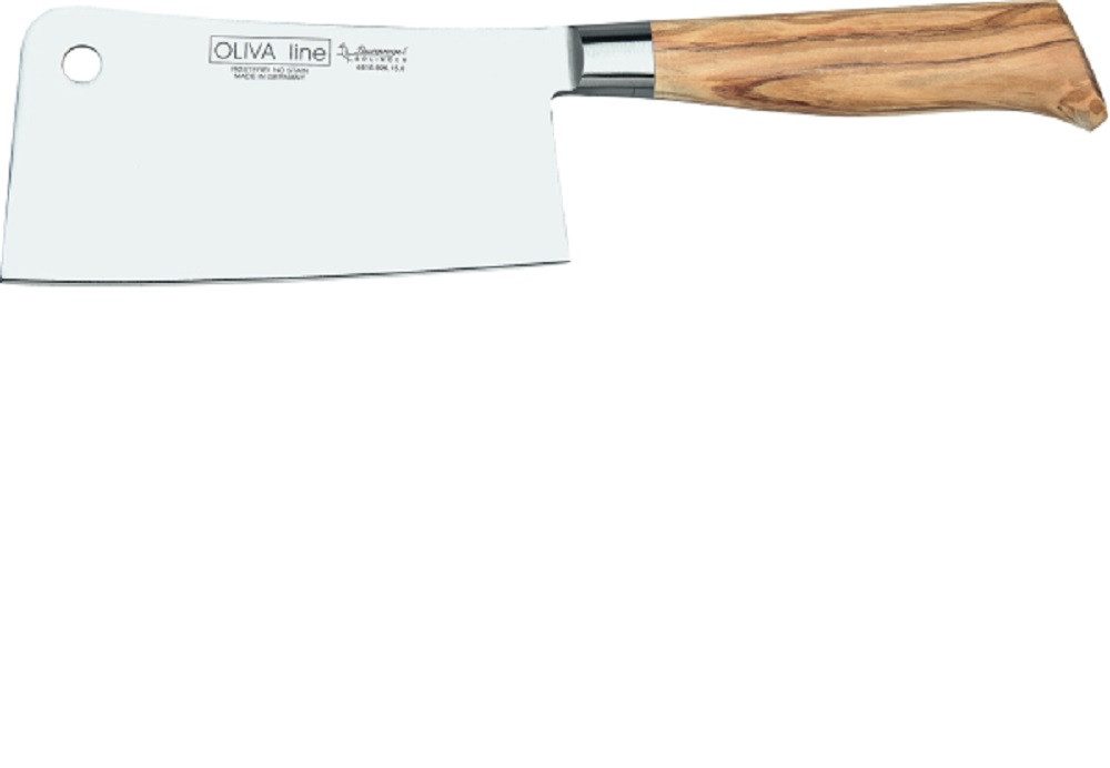 Die OLIVA line bietet Premiumqualität. Der ergonomisch geformte Griff aus hochwertigem Olivenholz kennzeichnet ihren besonderen Charakter. Die 15 cm lange Klinge ist aus einem Stück Chrom-Molybdän-Vanadium.Stahl X 50 CrMoV 15 geschmiedet. Das Hackmesser eignet sich mit der großflächigen, starren Klinge hervorragend zum durchtrennen kleinerer Knochen.