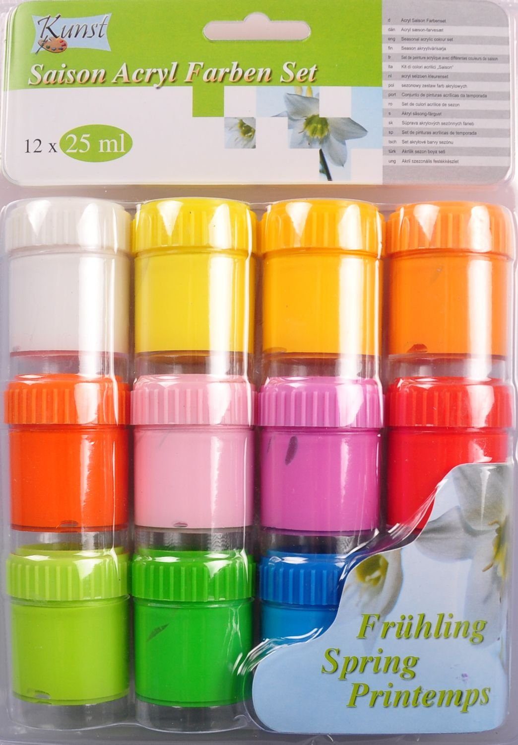 Acrylfarben-Set mit 12 verschiedenen Farbtönen in jeweils 25 ml Töpfen. Die Farben können hervorragend auf unterschiedlichen Oberflächen wie Leinwand, Karton, Papier, Spanplatten etc. verarbeitet werden.