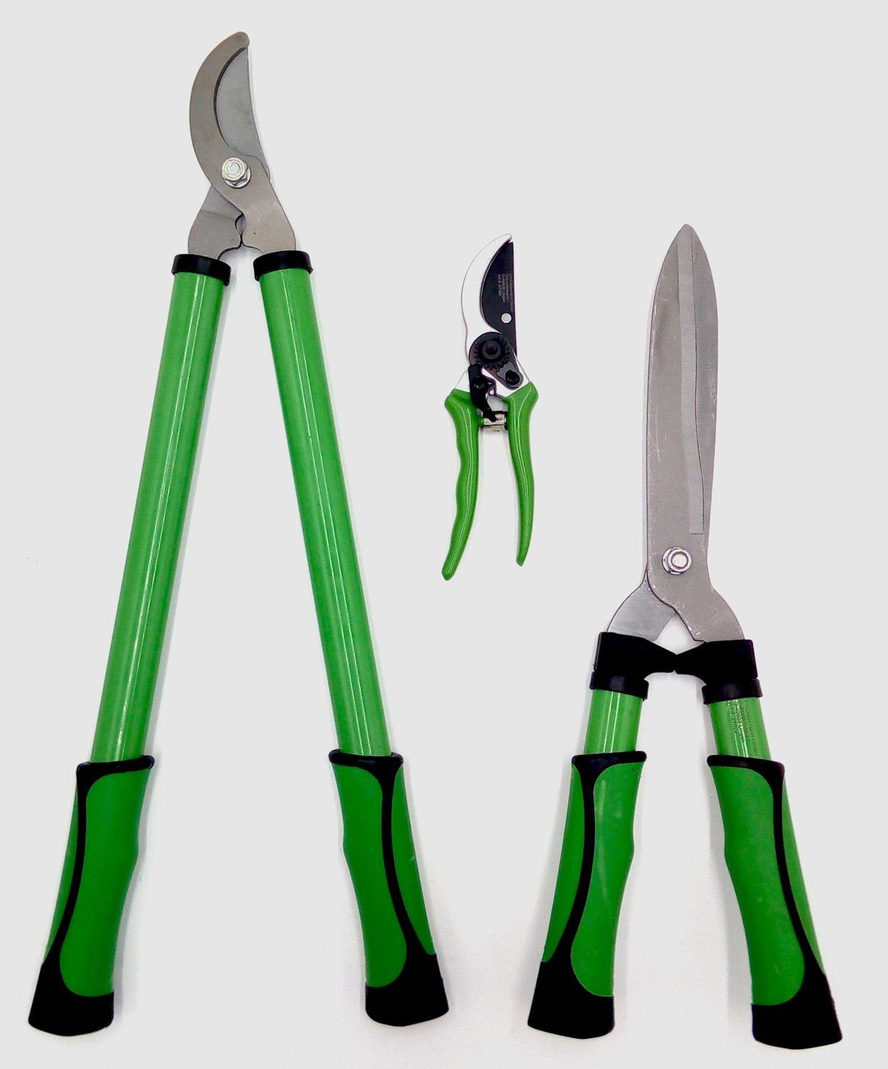 3-teiliges Gartenpflegeset bestehend aus Heckenschere, Astschere und Rosenschere.