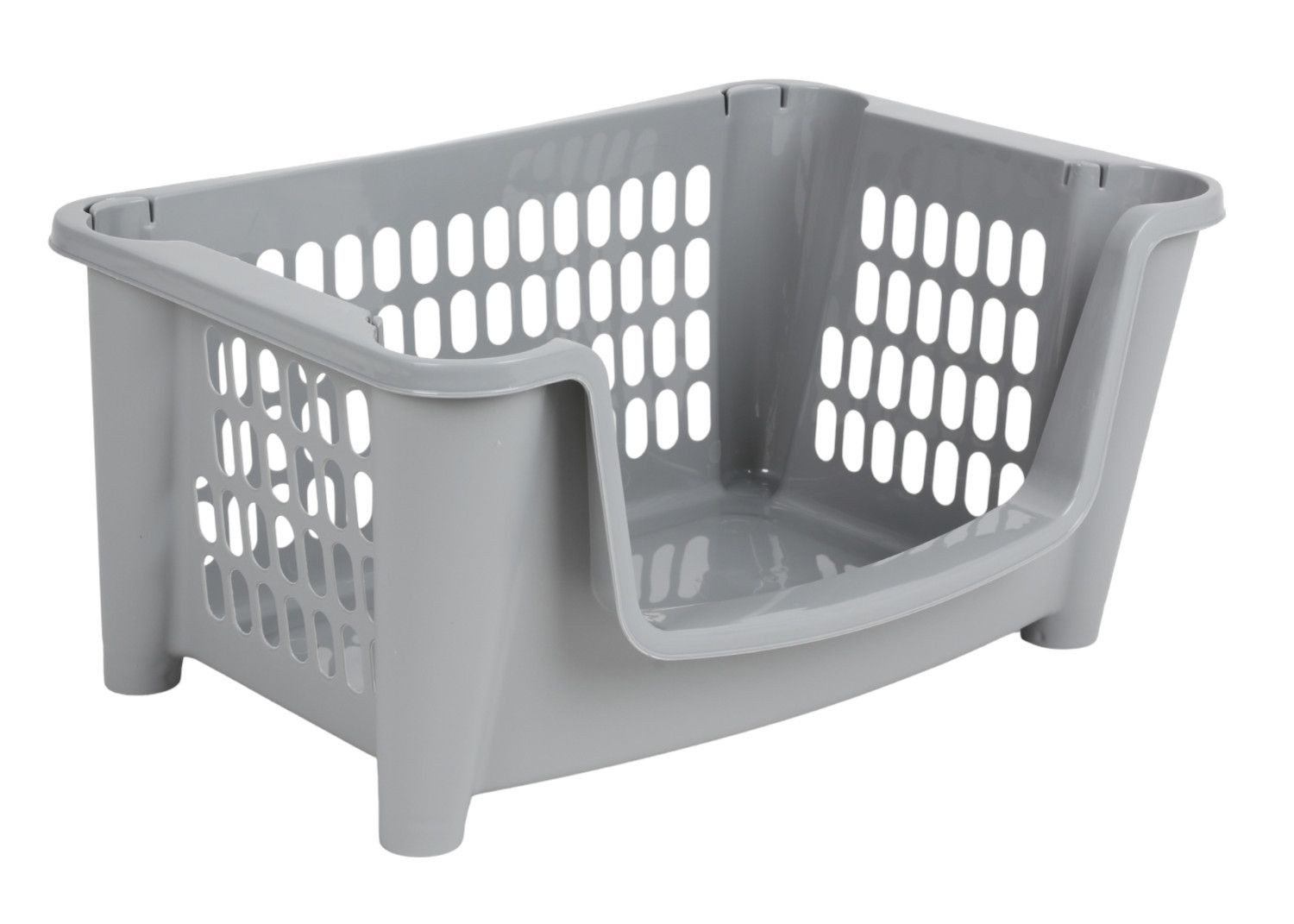Praktischer Stapelkorb aus robustem Kunststoff zum Aufbewahren von Obst und Gemüse, Pilzen, Backwaren, Haushaltsgegenständen, Spielzeug, Schuhen oder auch Werkzeug. Mehrere dieser Körbe können platzsparend ineinander, oder durch das komfortable Stecksystem zu einer Regalwand aufeinander gestapelt werden.