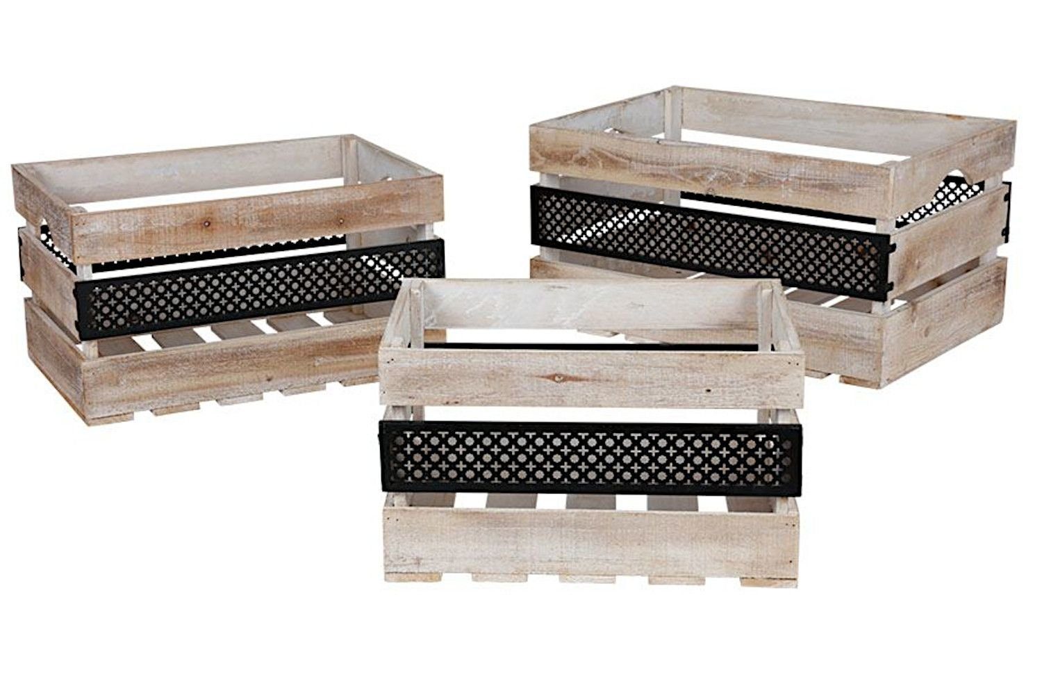 Spannender Materialmix aus grobem Holz im Used-Look und schwarzem Metall macht dieses 3-teilige Boxen-Set äußert dekorativ und interessant. Mit dem Lochblech zwischen den Holzlatten wird jede der drei unterschiedlich großen Kisten zu einem eindrucksvollen Hingucker. Prächtige Dekokisten und zugleich robuste Aufbewahrungsbehälter, die sich hervorragend zum Verstauen von diversen Utensilien eignen.