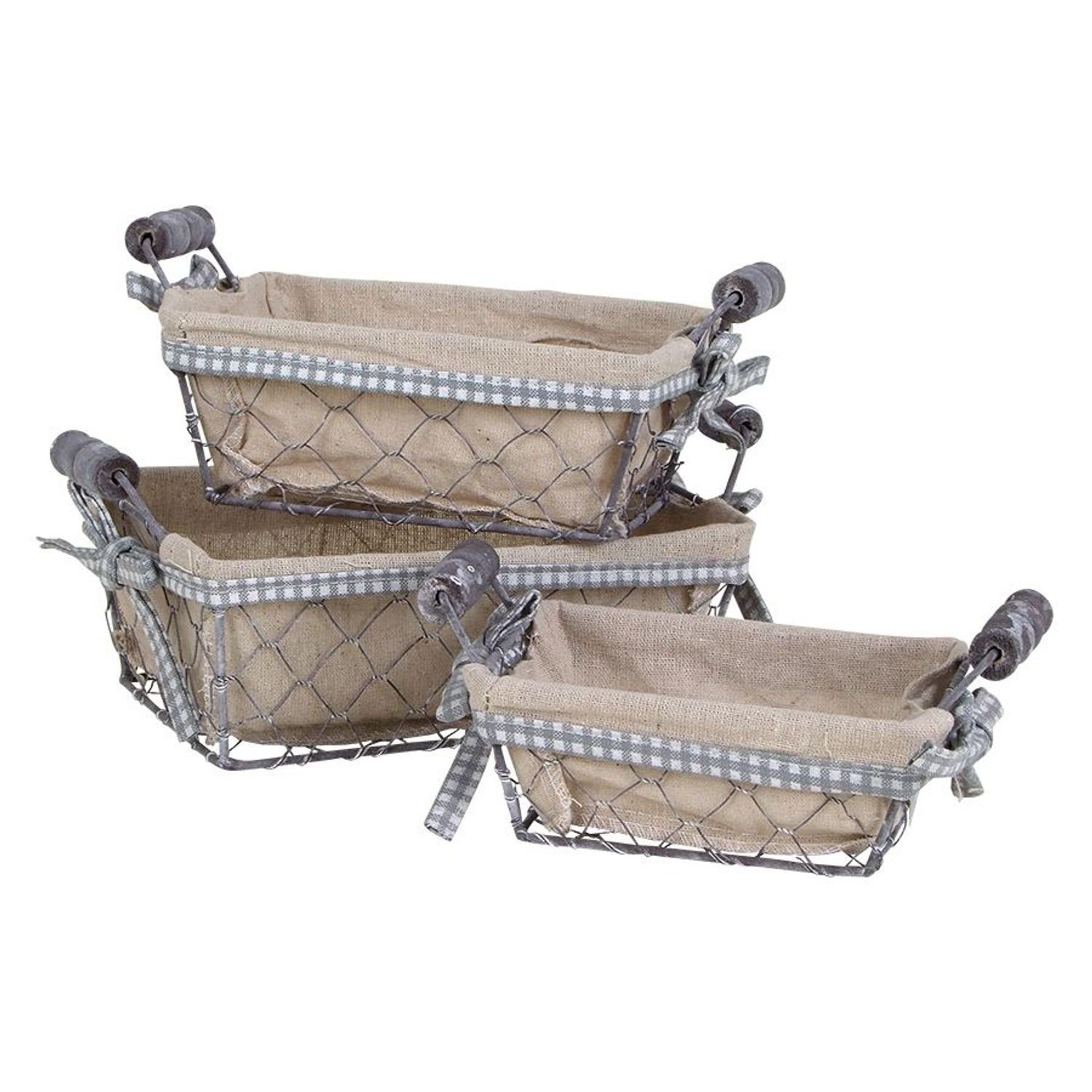 Dieses schöne, eckige 3-teilige Drahtkorb-Set im Landhausstil mit je 2 Griffen und ausgeschlagenem Stoff eignet sich optimal zum Dekorieren und macht auch als hübsche Geschenkidee einiges her.