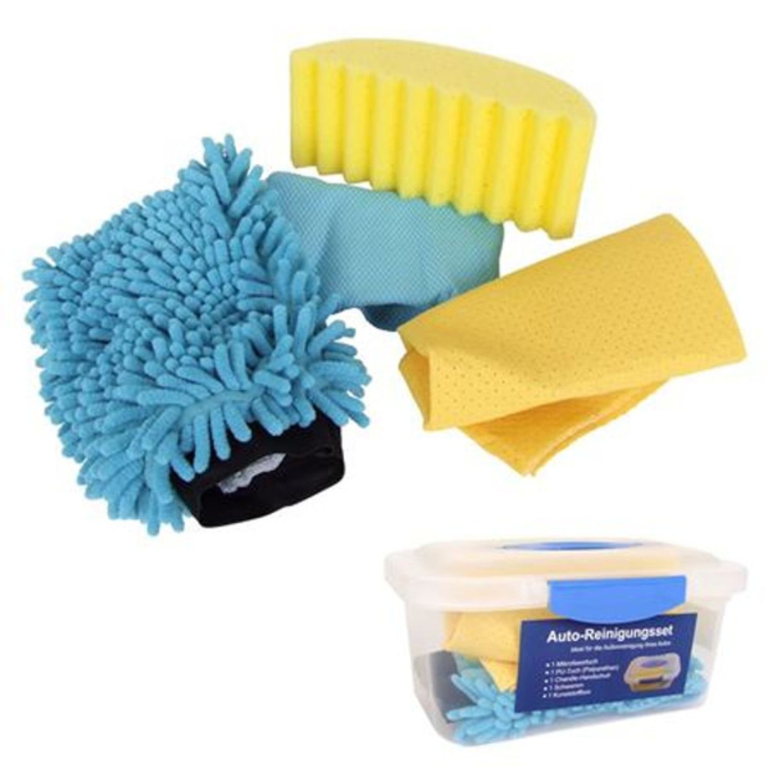 Auto-Reinigungsset bestehend aus 1x Mikrofasertuch, 1x PU-Tuch (Polyurethan), 1x Chenille-Handschuh, 1x Schwamm mit Rillen und 1x praktischer Aufbewahrungsbox. Ideal für die Außenreinigung Ihres Autos.