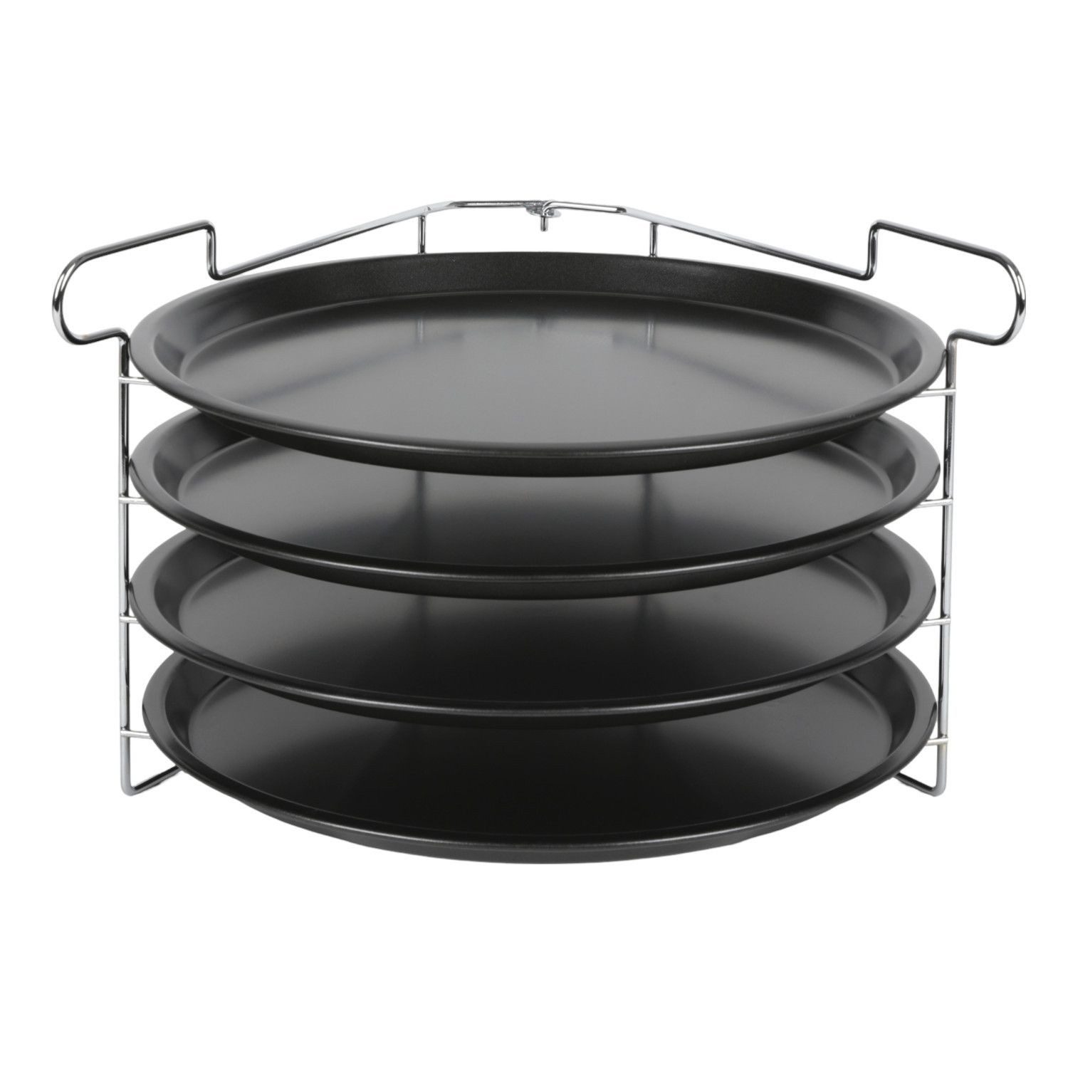- Lieferumfang: 4x runde Backbleche, 1x zusammenklappbarer Backblech-Ständer