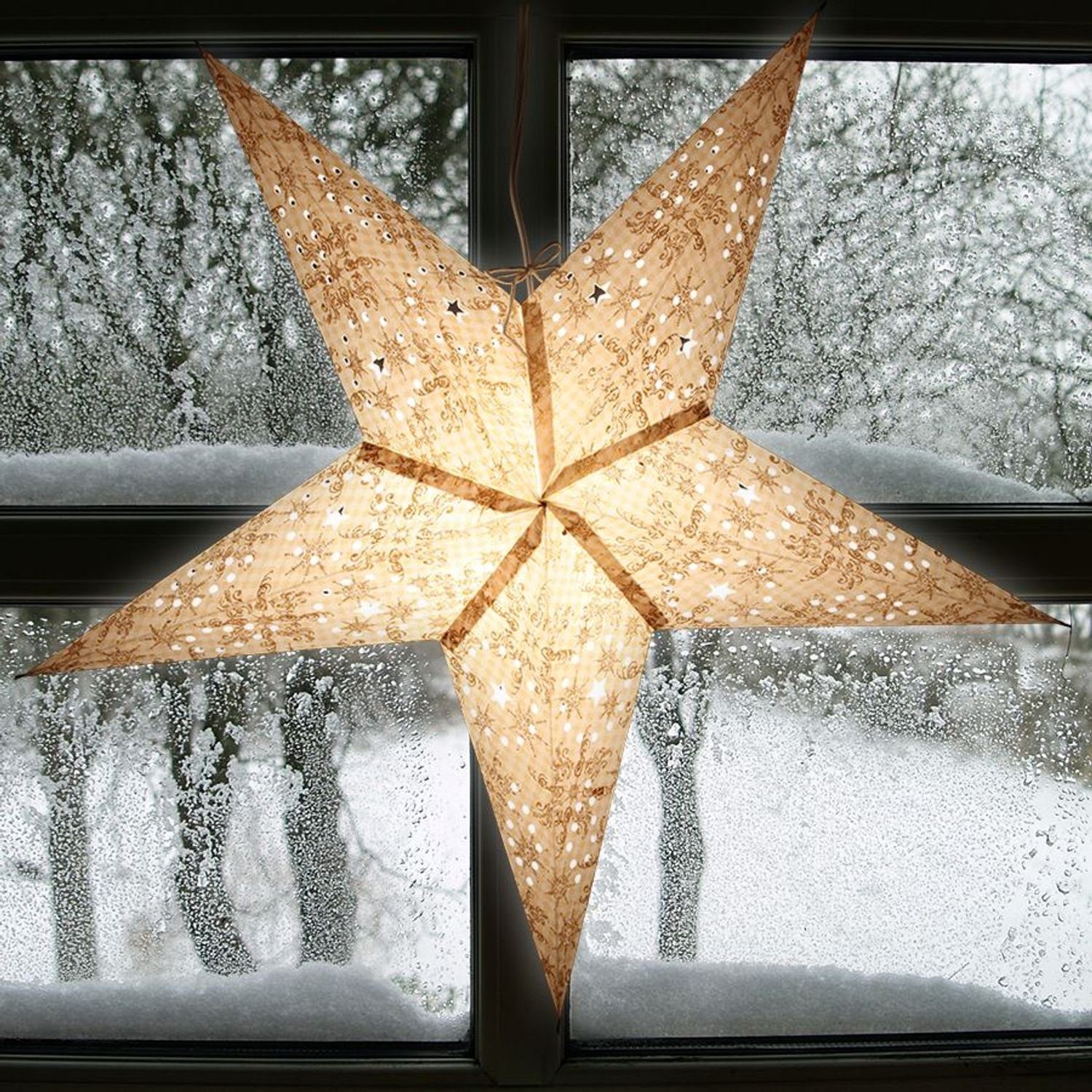 Wunderschöner weißer Papierstern mit goldfarbenen Glitzerpartikeln zur Fensterdekoration in der Winterzeit. Der Papierstern hat 5 Strahlen und eine Musterung mit Ornamenten und Sternausstanzungen. Der Schein des Sterns zaubert eine verträumte und weihnachtliche Atmosphäre in jeden Innenbereich.