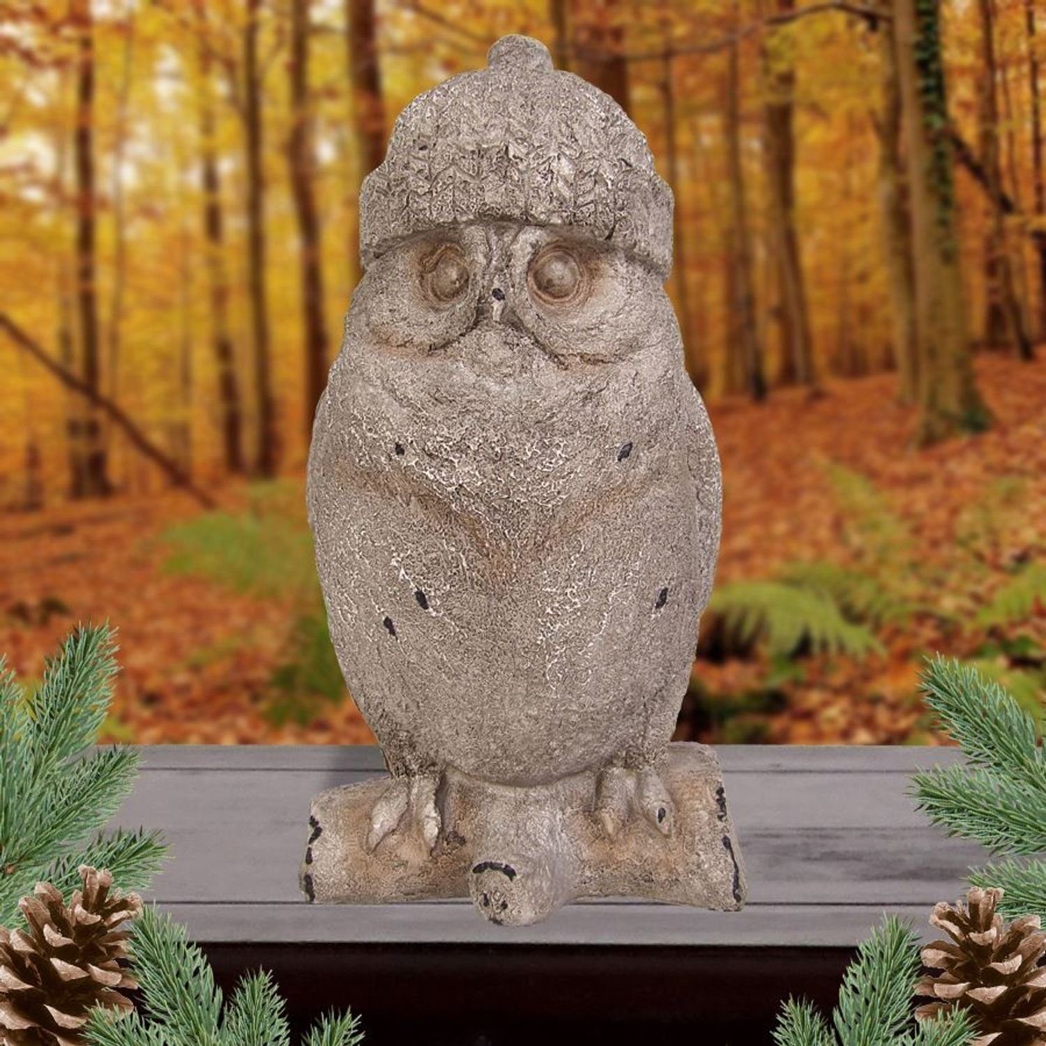 Schöne Deko-Eule mit Wollmütze aus witterungsbeständigem Polyresin in Steinoptik zum Verschönern von Gärten, Beeten, Gartenteichen, Terrassen, Eingangsbereichen und dem Innenbereich.