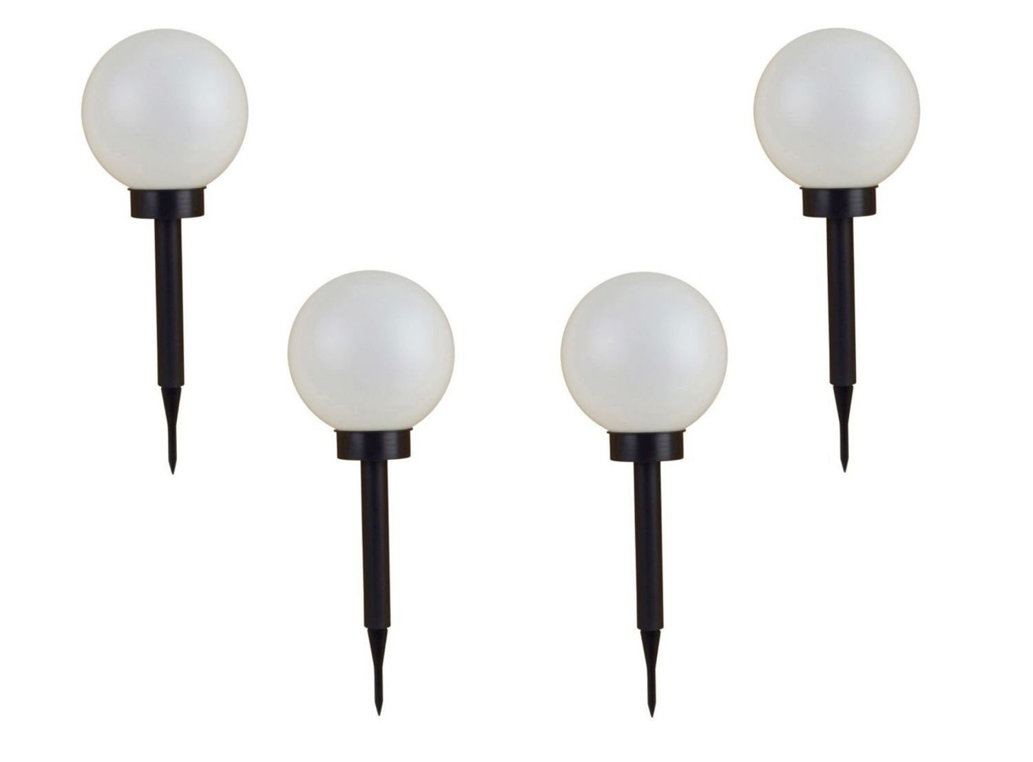 3in1 Garten-Kugelleuchte aus Kunststoff inklusive Erdspieß für den Außenbereich. Bei Dämmerung und Dunkelheit lassen 4 LED-Lämpchen diese Kugelleuchte in einem gedämpften Licht erstrahlen. Bei direkter Sonneneinstrahlung laden sich die integrierten Akkus durch eine Solarzelle automatisch wieder auf. Mithilfe der zwei Verbindungsstücke können Sie die Höhe der Kugel jederzeit individuell ändern.