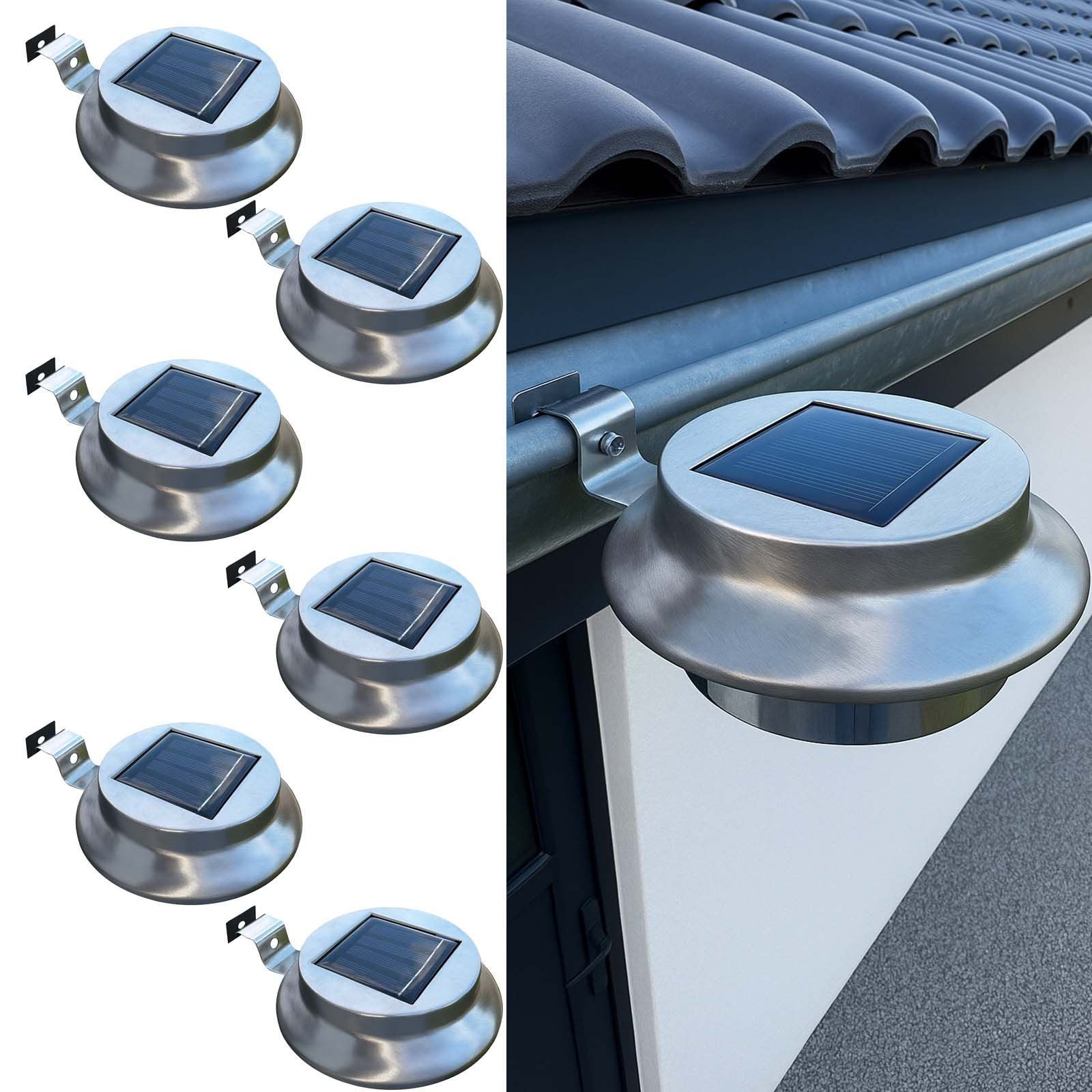 Solar Dachrinnenleuchten im 6er Set die ideale Lösung für eine unkomplizierte und dekorative Außenbeleuchtung. Jede Leuchte misst ca. 12 x 12 x 6 cm und ist kompakt, aber leistungsstark. Wetterfest nach IP44, trotzen die Lampen Regen und Feuchtigkeit und sind somit perfekt für den Einsatz an Dachrinnen, Gartenzäunen oder Schuppen. Dank des integrierten Dämmerungssensors schalten sich die Leuchten bei Einbruch der Dunkelheit automatisch ein und bei Tageslicht wieder aus. Jede Leuchte ist mit drei warmweißen LEDs ausgestattet, die ein stimmungsvolles Licht erzeugen. Der Betrieb erfolgt über Solarenergie mit zwei integrierten, wiederaufladbaren AA-Akkus pro Leuchte. Nach einer Aufladung von 68 Stunden beträgt die Leuchtdauer bis zu 8 Stunden. Das hochwertige Edelstahlgehäuse sorgt nicht nur für Langlebigkeit, sondern auch für eine moderne und elegante Optik. Im Lieferumfang ist sämtliches Montagematerial enthalten, wodurch die Installation schnell und einfach möglich ist ganz ohne aufwendige Werkzeuge. Mit diesen Solar Dachrinnenleuchten erhalten Sie eine nachhaltige, energieeffiziente und umweltschonende Beleuchtungslösung, die gleichzeitig dekorativ und praktisch ist.