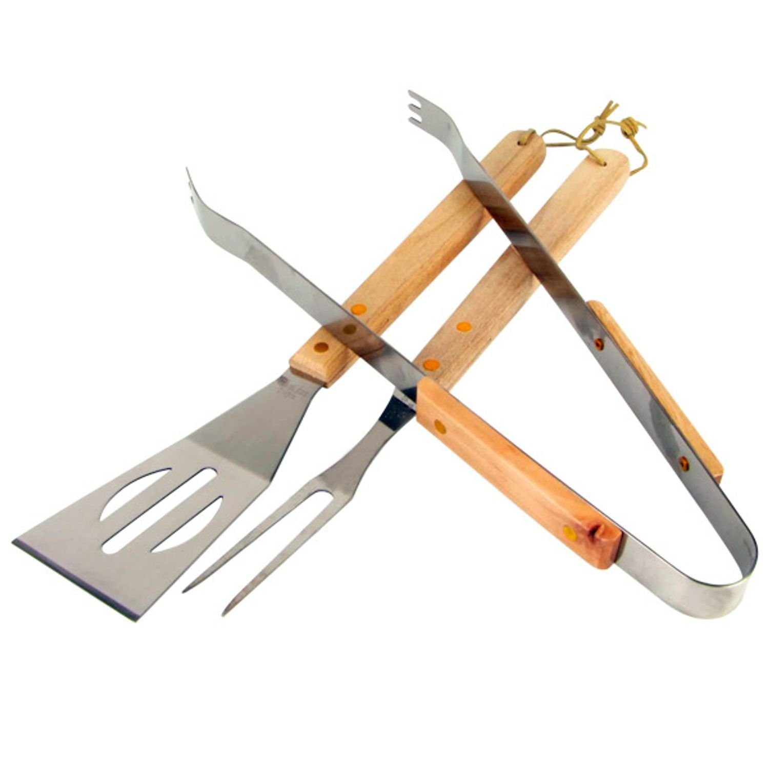Hochwertiges Grillbesteck aus Edelstahl mit Zange, Wender und Gabel für das perfekte Grillvergnügen. Der praktische Holzgriff hält die Hitze ab und erleichtert so das Drehen und Wenden.