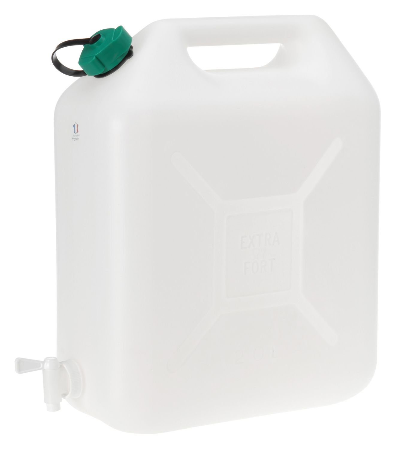 Lebensmittelechter Wasserkanister aus Kunststoff samt Auslaufhahn, Schraubverschluss und stabilem Transportgriff. Die 30mm große Öffnung ermöglicht ein leichtes Befüllen und Entleeren.