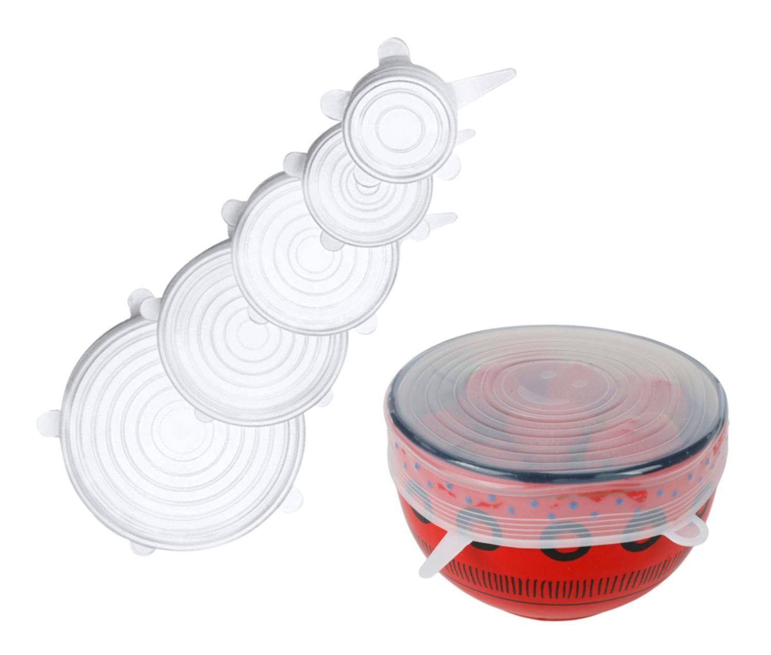 Mit diesen super elastischen Silikondeckeln können Sie ab sofort alle Dosen, Tassen, Schalen, Töpfe und Schüsseln luft- und flüssigkeitsdicht verschließen. Die transparenten Deckel lassen sich stark dehnen und mit Hilfe von je fünf Laschen perfekt um den gewünschten Behälter positionieren. Selbst angeschnittenes Obst wie z.B. ein halber Apfel oder halbe Melonen können fest umschlossen werden.