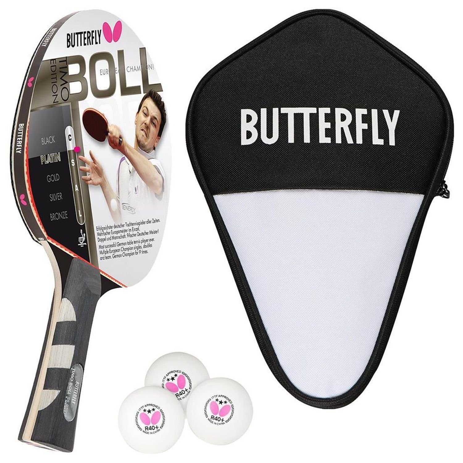 Lieferumfang | Butterfly 1x Timo Boll Platin 85025 Tischtennisschläger + Hülle + 3x Bälle |