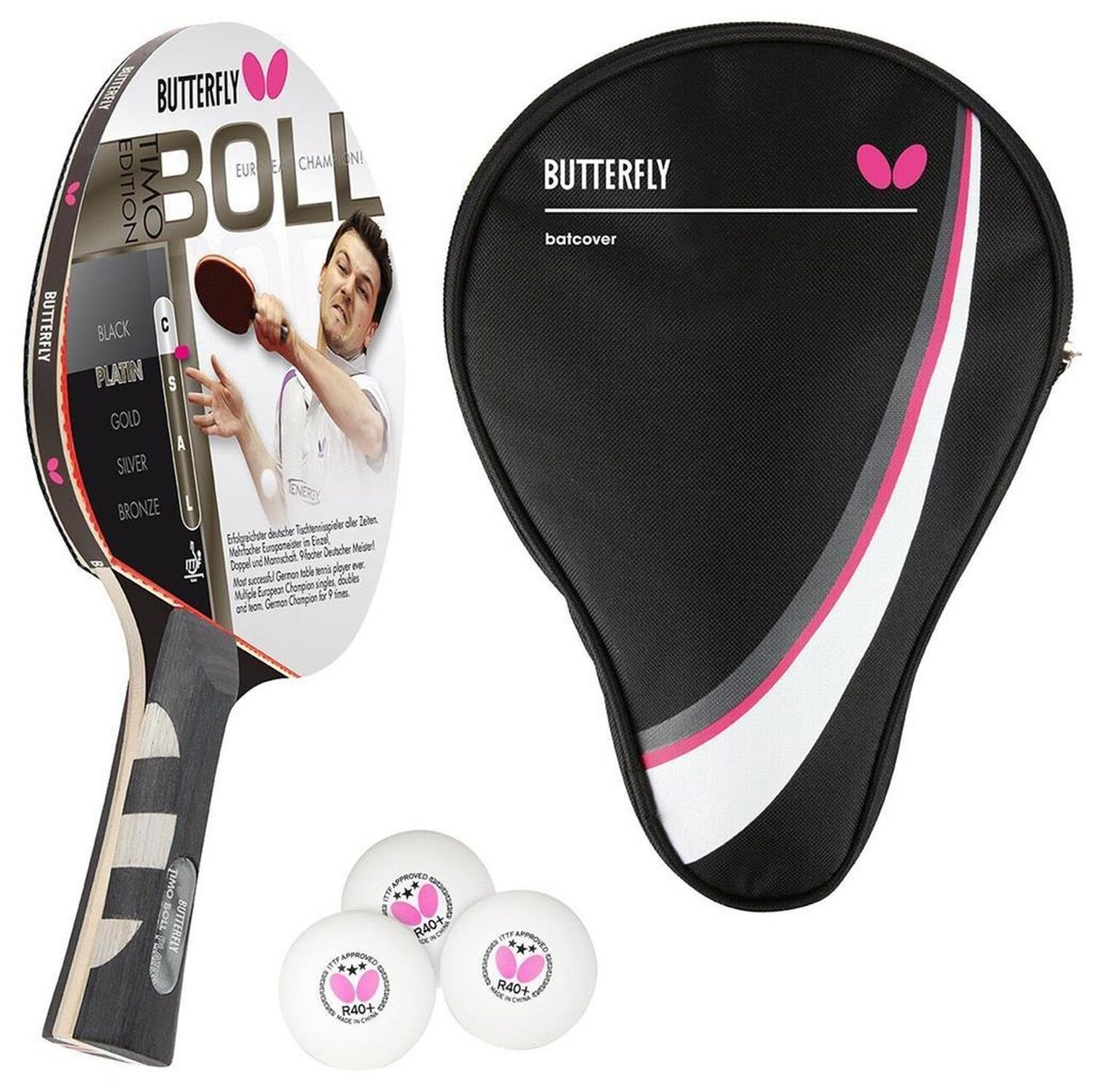 Lieferumfang | Butterfly 1x Timo Boll Platin 85025 Tischtennisschläger + Hülle + 3x TT Bälle |