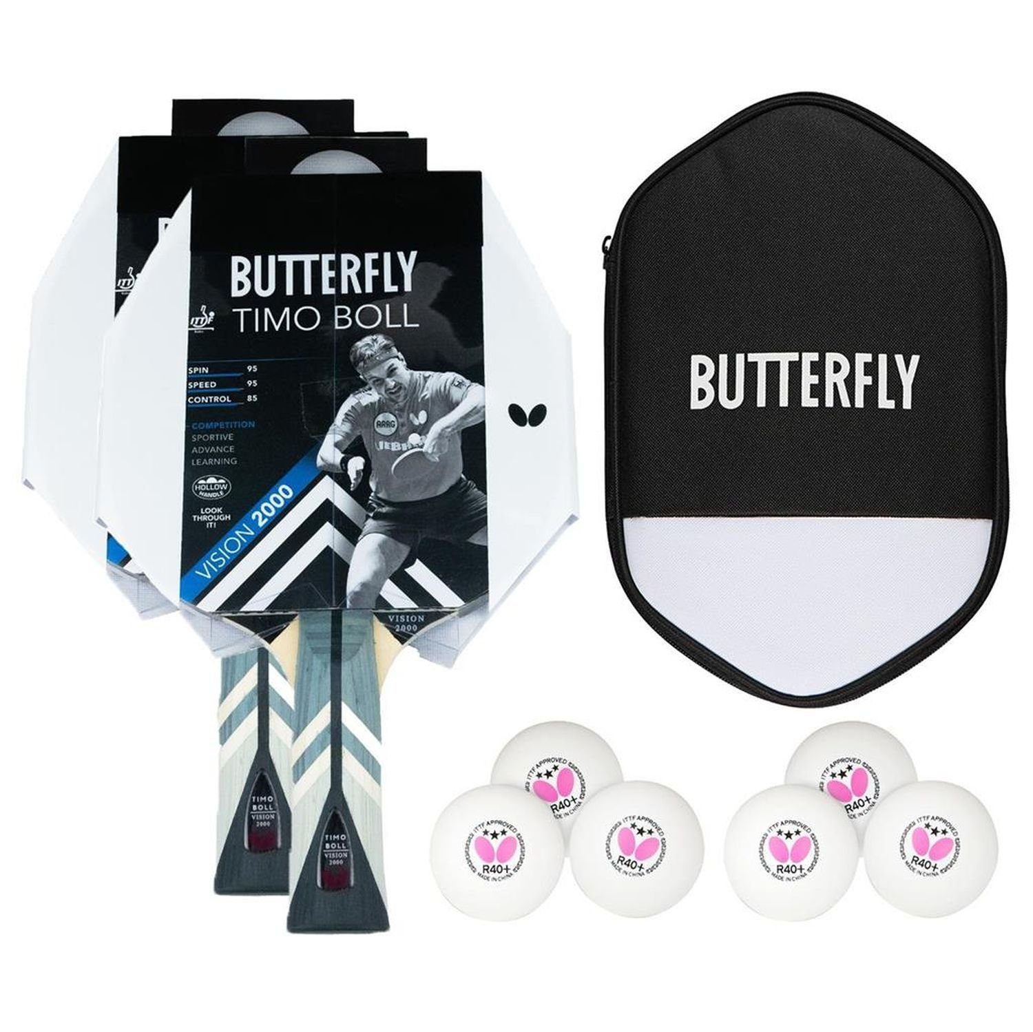 Butterfly 2x Timo Boll Vision 2000 Tischtennisschläger + Tischtennishülle + 6x 40+ 3*** Tischtennisbälle Ausgefeilter Profi Tischtennisschläger BUTTERFLY TIMO BOLL Vision 2000 für technisch fortgeschrittene Spieler. Wakaba Belag mit 2,0mm Schwamm, ermöglicht hohe Geschwindigkeit beim Offensivspiel. Anatomischer Griff. Der Tischtennisschläger besitzt außerdem ein 9mm Butterfly Kantenband, der Schläger ist mit einer aufwendigen Gestaltung verschiedener Holzschichten ausgestattet und eine Linse ist im Griff verbaut. Das besondere am Griff ist zudem noch die Technologie des Hollow Handle. Ein Hohlraum im Griff spart Gewicht. Das dadurch angenehmere Handling des Schlägers ist vor allem für Jugendliche und Anfänger geeignet. Die Beweglichkeit und Reaktionsgeschwindigkeit wird gefördert. Der Vision 2000 Schläger überzeugt mit seinen Werten ausgehend von 100: Speed 95 / Spin 95 / Control 85. Der Schläger wird in einer Halbblisterverpackung geliefert, der zum Schutz des Schlägers dient. Hochwertige Schlägerhülle Hochwertige Schlägerhülle BUTTERFLY CELL CASE II für 2 Schläger und 6 Bälle, Nylon 600 D in neuartiger und außergewöhnlicher Form, inkl. praktischer Schlaufe zum Aufhängen. TT-Bälle BUTTERFLY 3 STERN R40+, weiß, 3 Stk., Plastikball 40+. Die identische Dicke des Materials garantiert eine nahe perfekte Ball Performance auf Weltklasseniveau. Verschiedene Tests bestätigen konstante Leistungsfähigkeit hinsichtlich Rotation, Absprung und Flugverhalten. Die enorme Stabilität setzt neue Maßstäbe. In Kartonverpackung.
