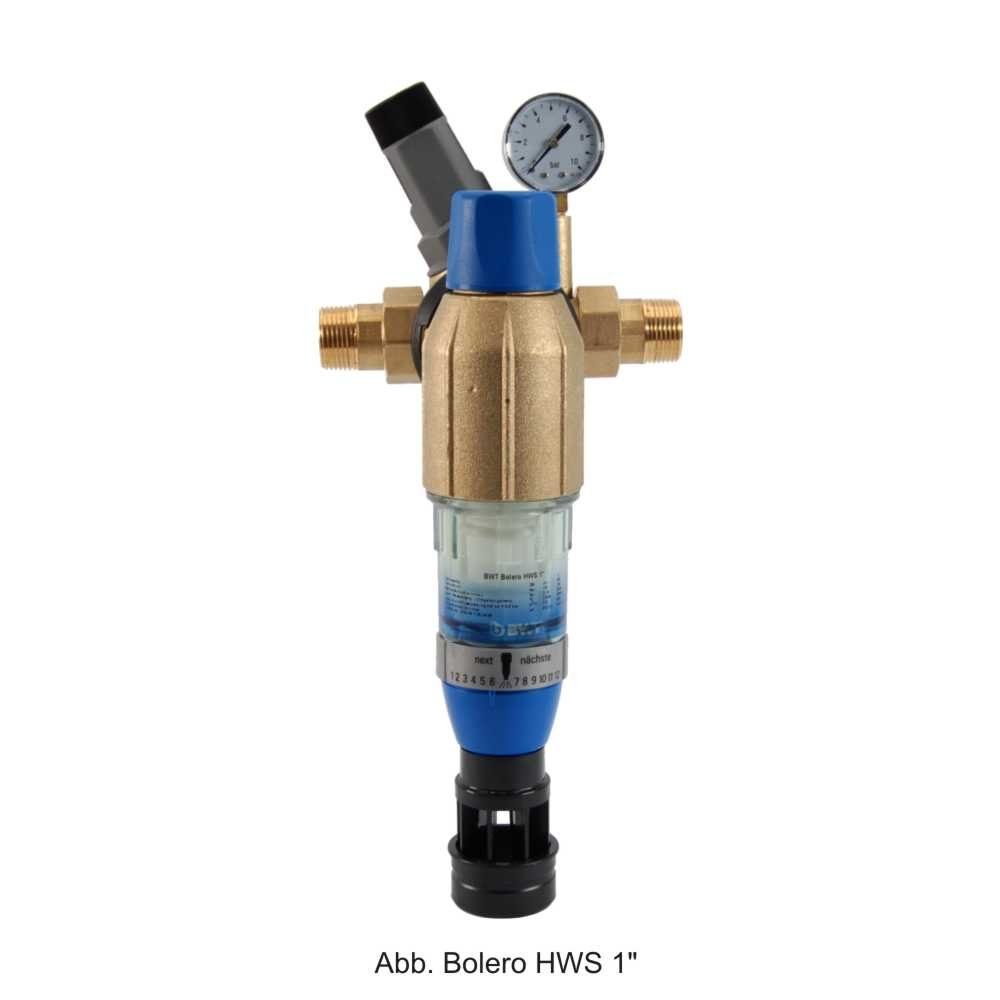 Eigenschaften: Bolero HWS 1 Hauswasserstation Fabrikat BWT mit Anschluss mit Druckminderer für den Einbau in Trink- und Brauchwasser- systemen. Zum Schutz vor Funktionsstörungen und Korrosionsschäden durch Fremdpartikel wie Rostteilchen, Späne, Sand, Hanf usw.. Der Filter ist nicht einsetzbar zur Filtration von Teilchen Größer 2mm Durchmesser, Prozesswasser, Kühlwasser für Durchlaufkühlungen und chemi- kalienbehandelten Kreislaufwässern. Für alle Fette, Lösungsmittel, Seifen und sonstigen schmierenden Medien ist der Filter nicht geeignet. Ebenso nicht zur Abscheidung wasserlöslicher Stoffe. Lieferumfang: Hauswasserstation mit Anschlussver- schraubungen und Dichtungen, Filterelement mit grosser Filterfläche gemäss DVGW-Richtlinie, Kopfteil aus Messing, Anschluss-Stück aus Messing mit Druckminderer, Klarsichtzylinder, Rückspülelement und HT- Anschluss für Spülwasser. Datumsring zum Einstellen des nächsten Rückspüldatums und Dreh- knopf für manuelle Rückspülungen. Hinterdruckmanometer, Anzeige für Hinterdruckeinstellwert und Drehknopf für Druckminderer. Technische Daten: Bolero HWS 1 Anschlussnennweite DN 25 Durchflussleistung bei dp 0,2 bar 3,5 m3/h Durchlassweite untere/obere 90/110 my Nenndruck 16 PN Betriebsdruck min/max 2-16 bar Wassertemp. min/max 5-30 Grad C Umgebungstemp. min/max 5-30 Grad C Baulänge ohne Verschraubung 100 mm Baulänge mit Verschraubung 184 mm Gesamthöhe RF/HWS 350 mm Mindestabstand Rohrmitte bis Boden 350 mm HT-Anschluss, Durchmesser 50 mm Gewinde Überwurfmutter 1 1/4 Betriebsgewicht ca. 3,3 kg BWT10370