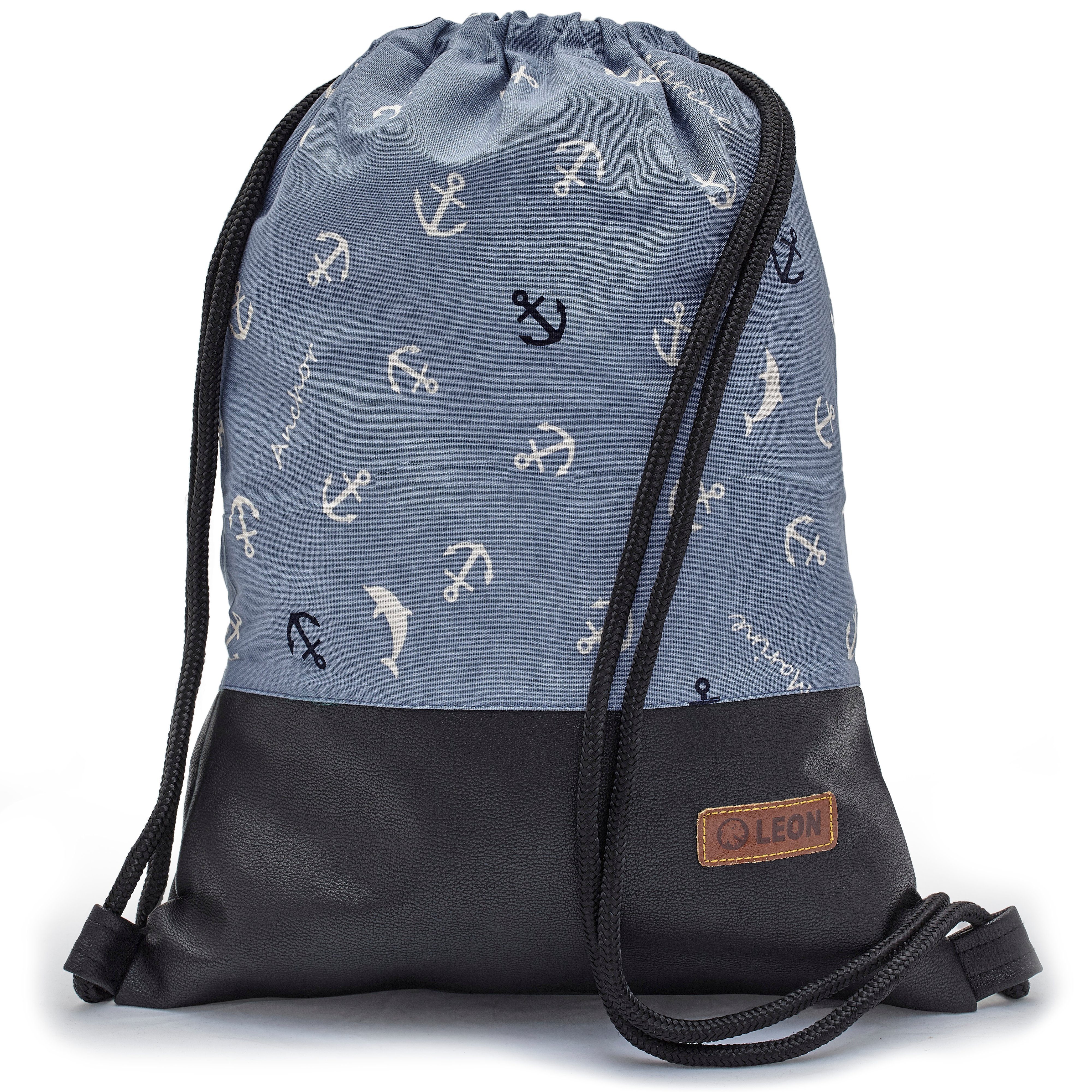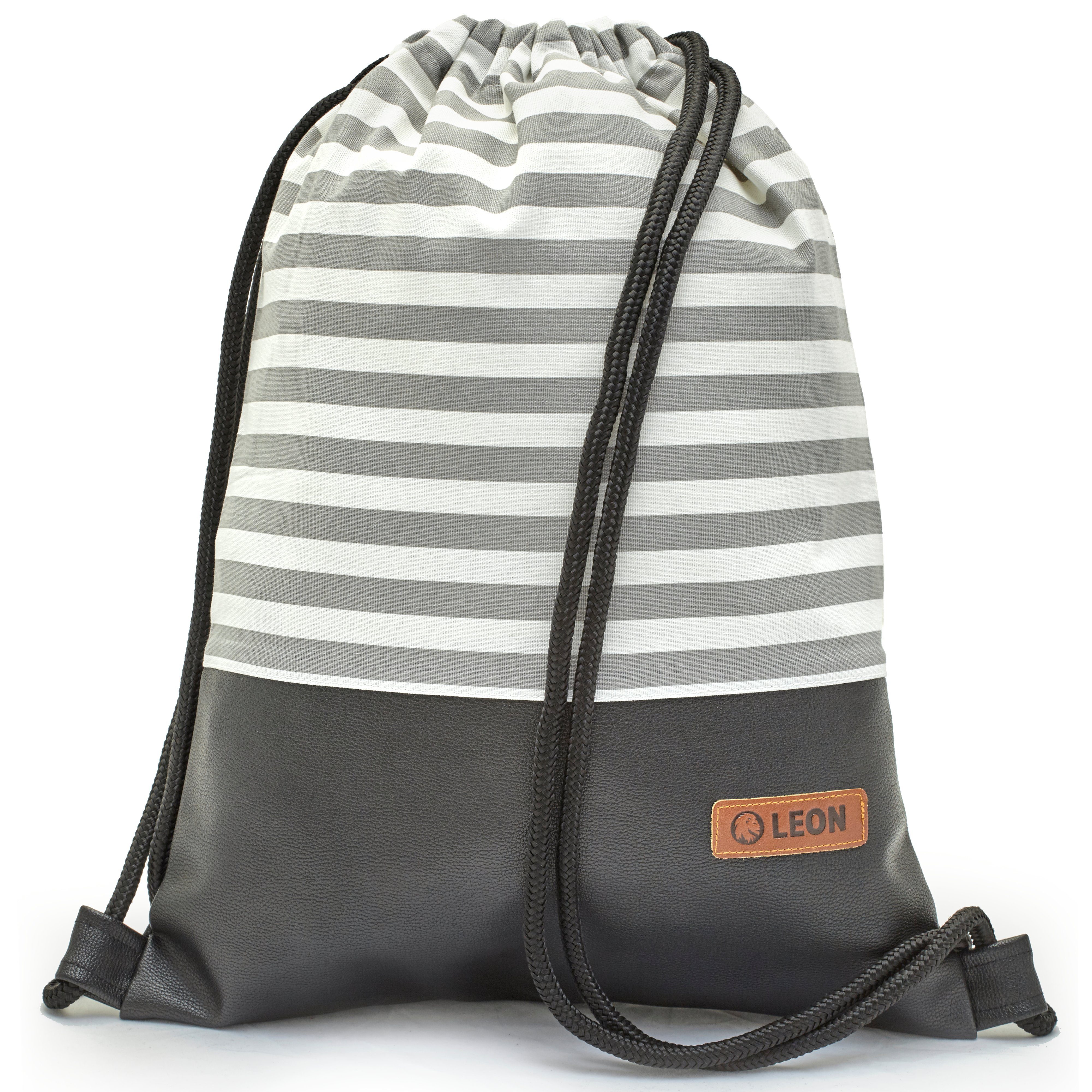 LEON By-Bers Freizeit Tasche Baumwolle Turnbeutel Rucksack Sportbeutel Beutelrucksack Freizeitrucksack Gym Bag Gymsack Hipster Fashion Damen & Herren, schwarzes Kunstleder Unterteil, extra dicke Nylonseile weich und sehr stabil, Unterteil dickes Segeltuch, lässig sportlich und urban, perfekt zum Bummeln, kleine Einkäufe oder Festival, sehr sorgfältig handgenäht, entworfen und verpackt in Berlin