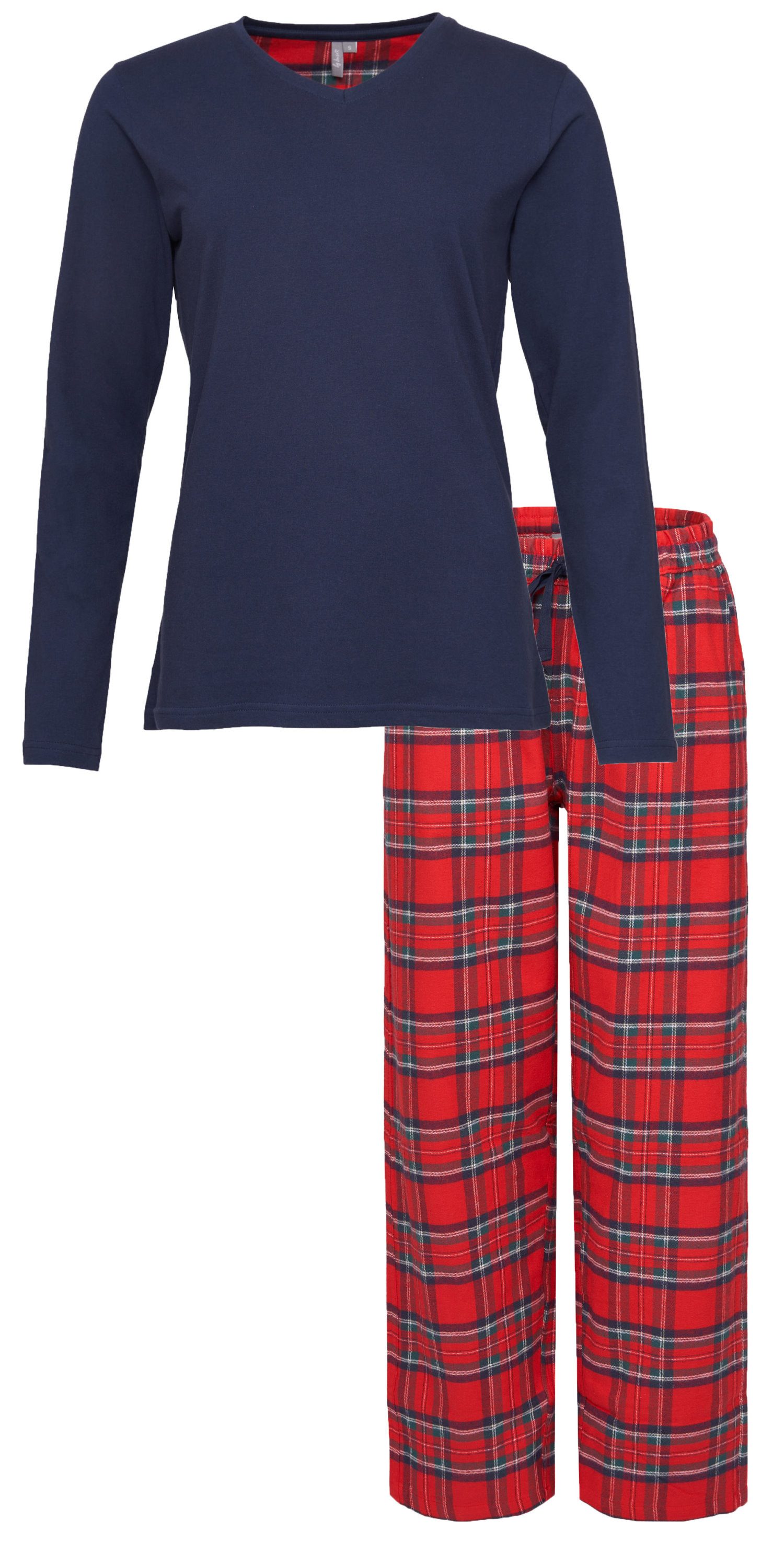 Dieser gemütliche by Louise Damen Schlafanzug kombiniert zeitlosen Stil mit maximalem Komfort und besteht aus hochwertigen Materialien, die für eine angenehme Nachtruhe sorgen. Das Set besteht aus einem Oberteil und einer Hose, die beide aus 100% Baumwolle gefertigt sind, wodurch es besonders hautfreundlich und atmungsaktiv ist. Das Oberteil besticht durch seine schlichte Eleganz in unifarbener Optik aus Single-Jersey-Qualität. Es bietet eine weiche Haptik und schmiegt sich sanft an die Haut an. Der klassische V-Ausschnitt sorgt für eine feminine Note und verleiht dem Design eine ansprechende Optik. Die Hose präsentiert sich in einem charmanten Karomuster aus hochwertigem Flanell. Dieses Material ist angenehm warm und ideal für kühlere Nächte geeignet. Der bequeme Bund ist mit einem Gummizug sowie einem zusätzlichen Tunnelzug ausgestattet, der eine individuelle Anpassung und optimalen Halt ermöglicht, ohne einzuengen. Dieser Schlafanzug verbindet Funktionalität mit stilvollem Design und ist die perfekte Wahl für entspannte Stunden zu Hause oder eine erholsame Nacht. Die sorgfältige Verarbeitung und die Verwendung natürlicher Materialien machen ihn zu einem langlebigen Begleiter in Ihrem Kleiderschrank.