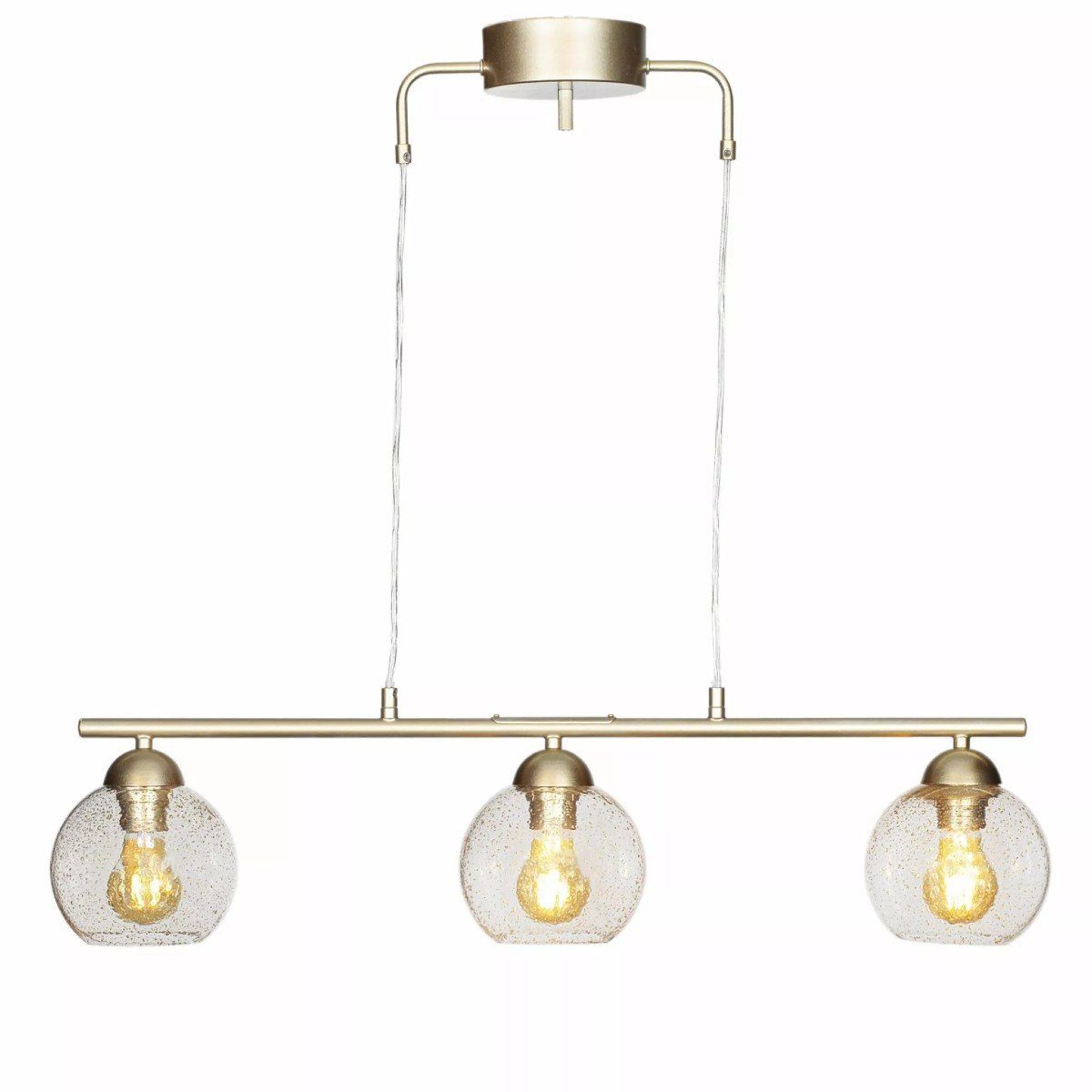 Durch die richtige Platzierung wird sie zum wahren Hingucker. Die Golden Bar besticht durch ihr mattgoldenes Gestänge und die filigranen Gläser. Die drei runden Gläser haben kleine Lufteinschlüsse, welche die Pendelleuchte besonders mystisch wirken lassen. Die transparenten Kabel sind 120 cm lang und können auf eine beliebige Длина gekürzt werden. Tipp: Als optimale Montagehöhe sagt man, dass die Leuchte ca. 70 cm über der Tischplatte aufgehängt werden soll. Damit haben Sie am Esstisch freie Sicht!
