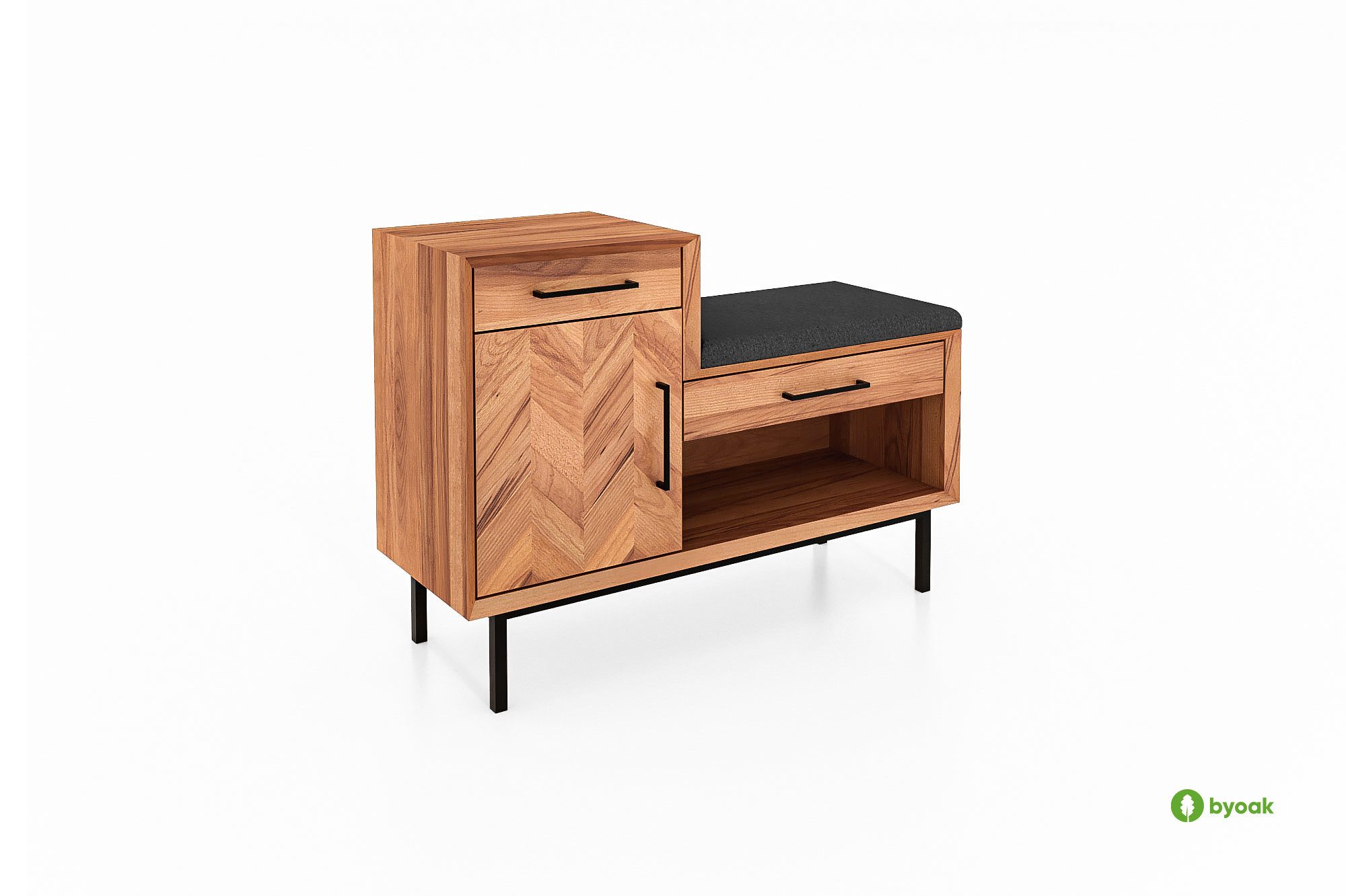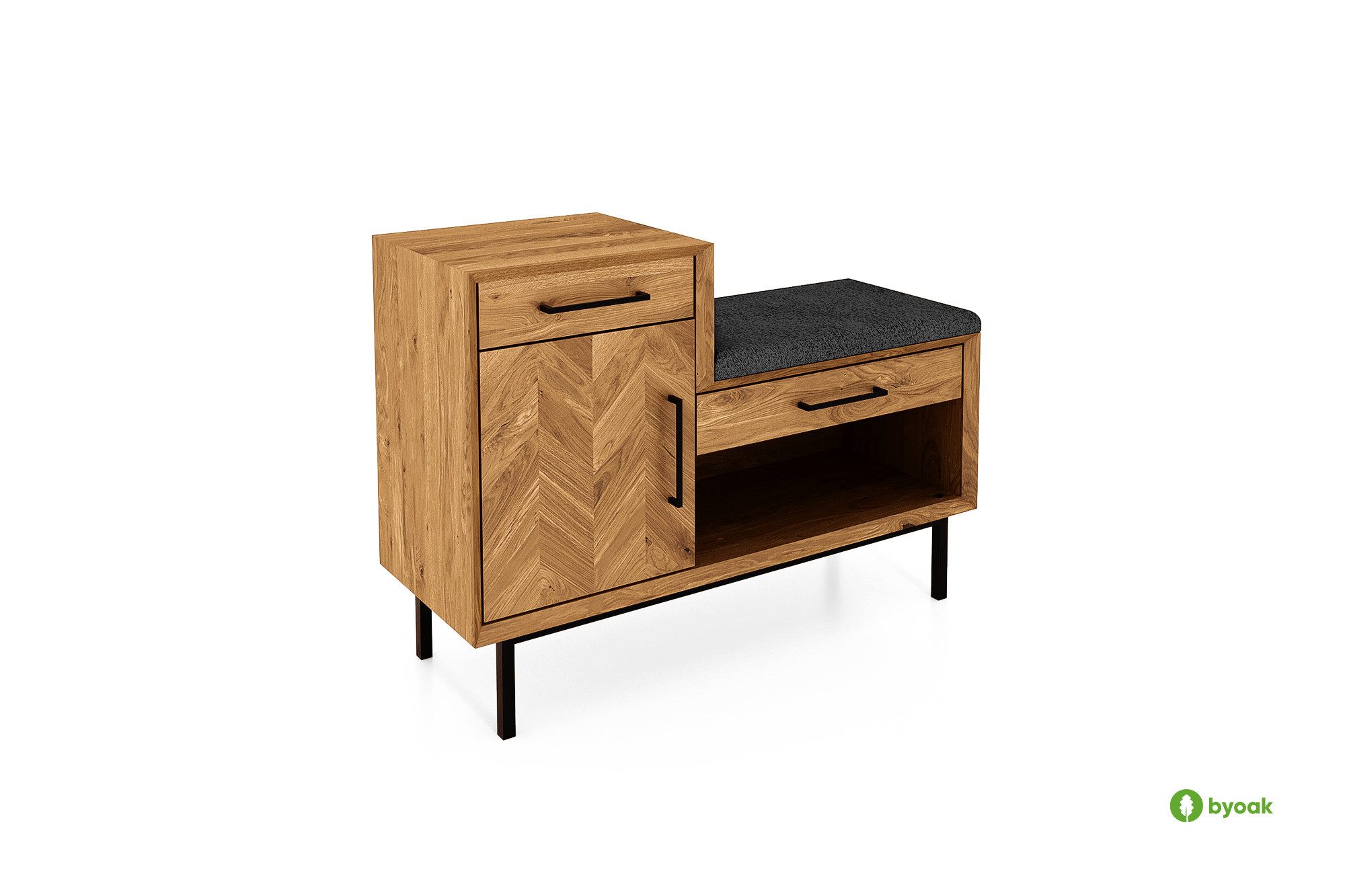 Der Flurschrank Abies ist eine einzigartige Kombination aus natürlichen Materialien, solider Verarbeitung und elegantem Stil, die sich perfekt in verschiedene Inneneinrichtungen einfügt. Aus massivem Buchen- oder Eichenholz gefertigt, garantiert es Langlebigkeit und zeitlosen Charakter. Die Schönheit des Naturholzes wird durch eine einzigartige Front mit Fischgrätenmuster bereichert, die dem Schrank ein ungewöhnliches Aussehen verleiht und dezent die Blicke auf sich zieht. Das ist ein Element, das den Raum belebt und ihm Klasse und Stil verleiht. Dank solider Metallbeine und -griffe erhält der Abies-Schrank einen modernen, industriellen Akzent und sorgt gleichzeitig für Stabilität und Haltbarkeit, auch bei intensiver Nutzung. Metallgriffe passen nicht nur perfekt zu Naturholz, sondern erleichtern auch das Öffnen von Schubladen und Türen, was die Nutzung des Schranks bequem und komfortabel macht. Der Abies-Schrank wurde mit Blick auf Funktionalität entworfen – sein Innenraum bietet eine praktische Schuhablage, die es Ihnen ermöglicht, Ihre Schuhe ordentlich und ästhetisch aufzubewahren. Darüber hinaus ist er mit zwei geräumigen Schubladen ausgestattet, deren Böden mit einem dunklen, weichen Material ausgekleidet sind, das die aufbewahrten Gegenstände vor Kratzern schützt. Dieser elegante Stoff verleiht dem Ganzen einen exklusiven Charakter und lässt das Innere der Schubladen stilvoll und benutzerfreundlich wirken. Perfekt zum Aufbewahren von Schlüsseln, kleinen Accessoires oder anderen Gegenständen, die es wert ist, immer zur Hand zu sein. Der Abies-Schrank ist eine Lösung, die Ästhetik mit Zweckmäßigkeit verbindet und sich perfekt für jeden Flur eignet, wo er nicht nur ein praktischer Aufbewahrungsort, sondern auch ein raffinierter dekorativer Akzent ist, der den Charakter des Innenraums unterstreicht.