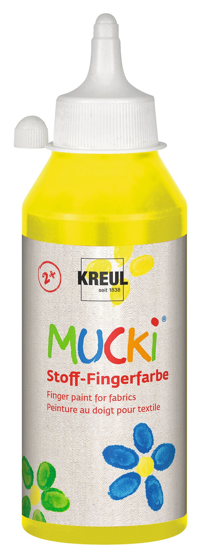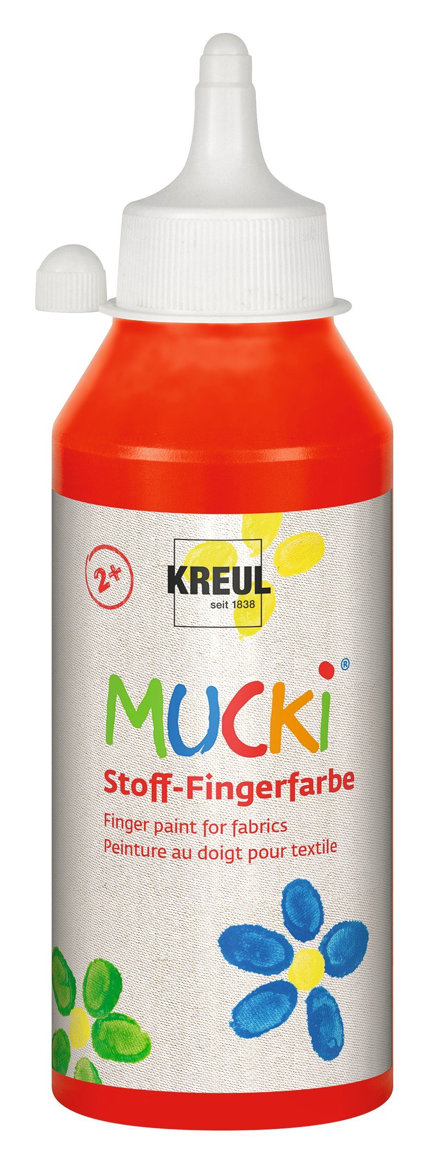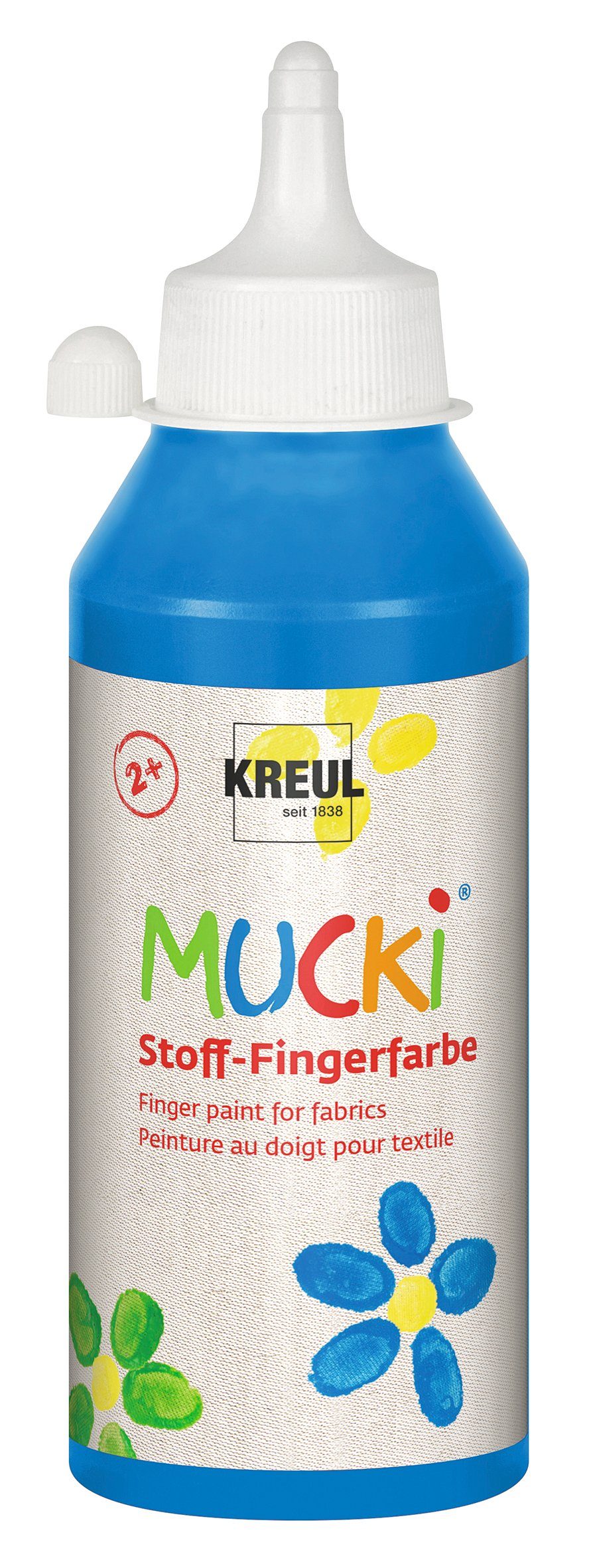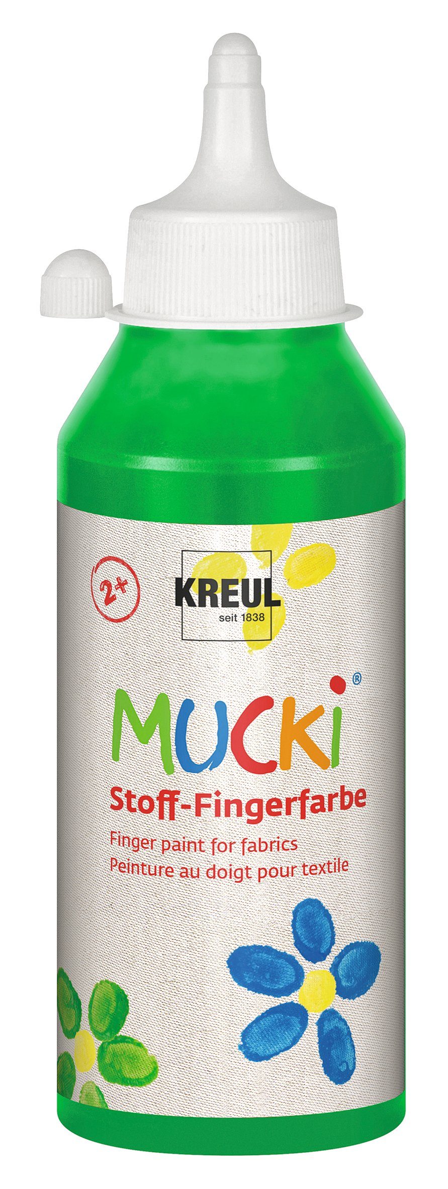 MUCKI Stoff-Fingerfarbe mit 250 ml Inhalt ist jede Menge leuchtende Stoffmalfarbe und Fingerfarbe in einem. Speziell entwickelt für Kinder ab 2 Jahren, ideal zum Malen mit Fingern, Pinsel oder Stempel.