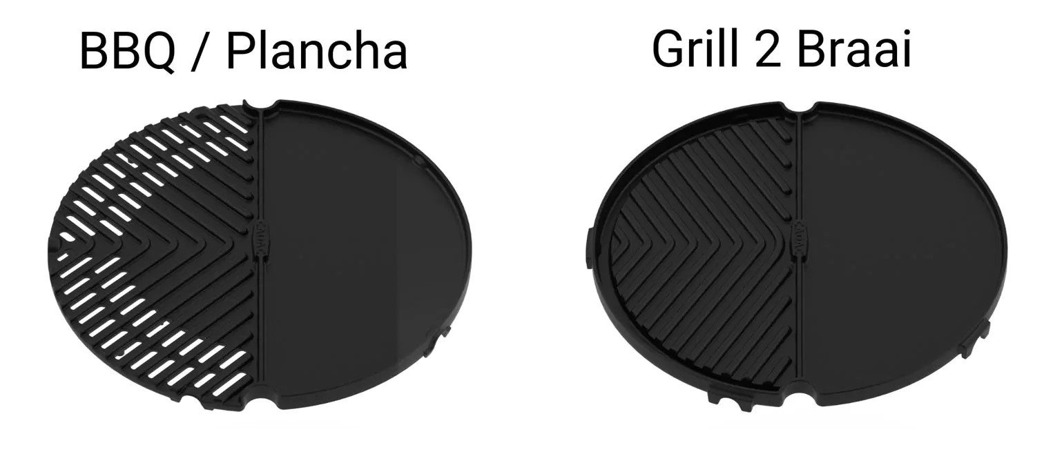 Im Vergleich zur BBQ/Plancha hat die Grill 2 Braai keinen durchlässigen Grillrost, sondern bietet eine durchgehende Grillfläche. Die BBQ/Plancha kombiniert einen Grillrost mit Löchern, um Fett abtropfen zu lassen, und eine glatte Plancha-Seite.