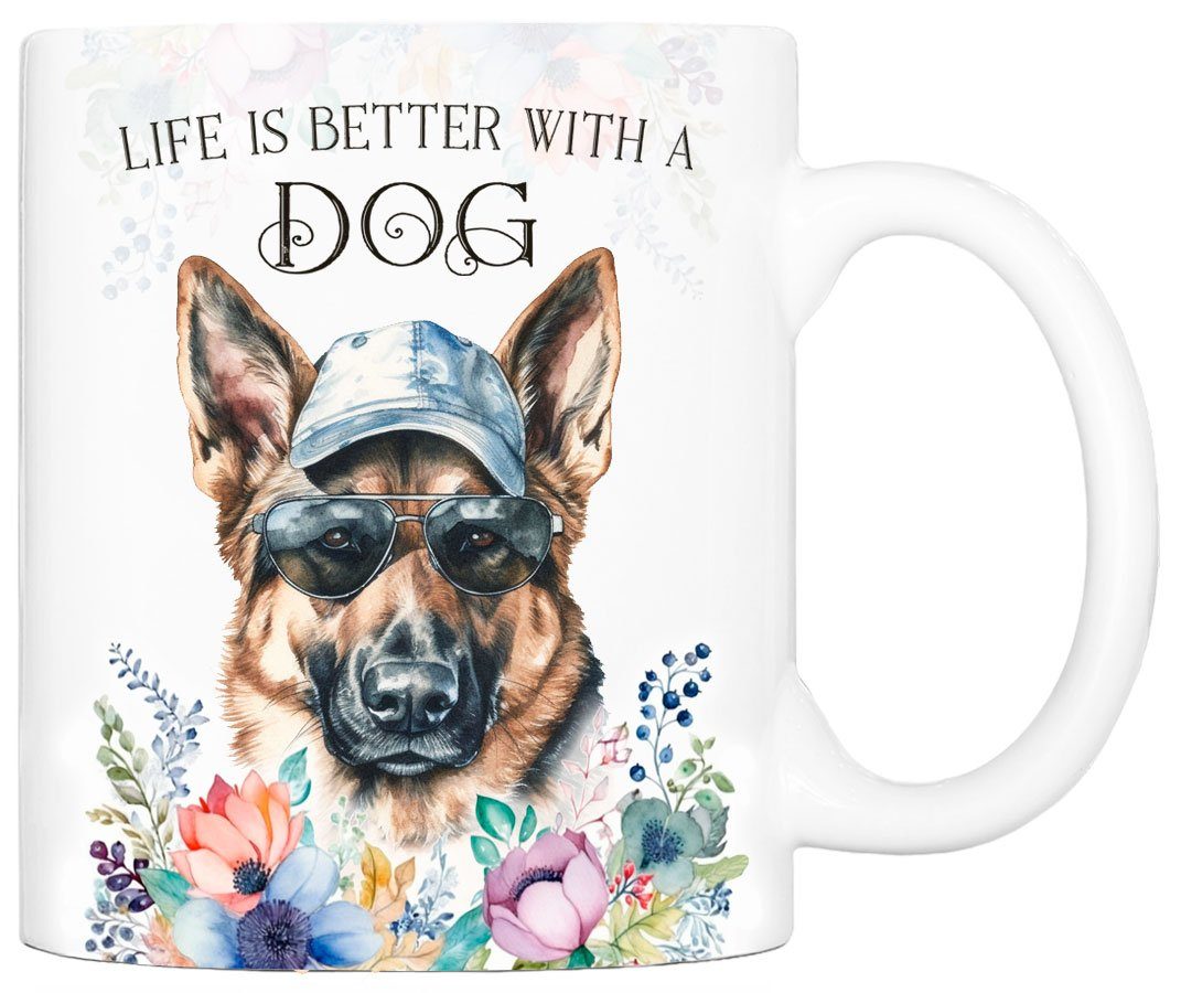 Die fröhlich bunte Tasse mit Hunderasse im Watercolor-Stil und "Life is better with a Dog" Schriftzug macht den Kaffee am Morgen und den Tee am Abend zu etwas ganz Besonderem!