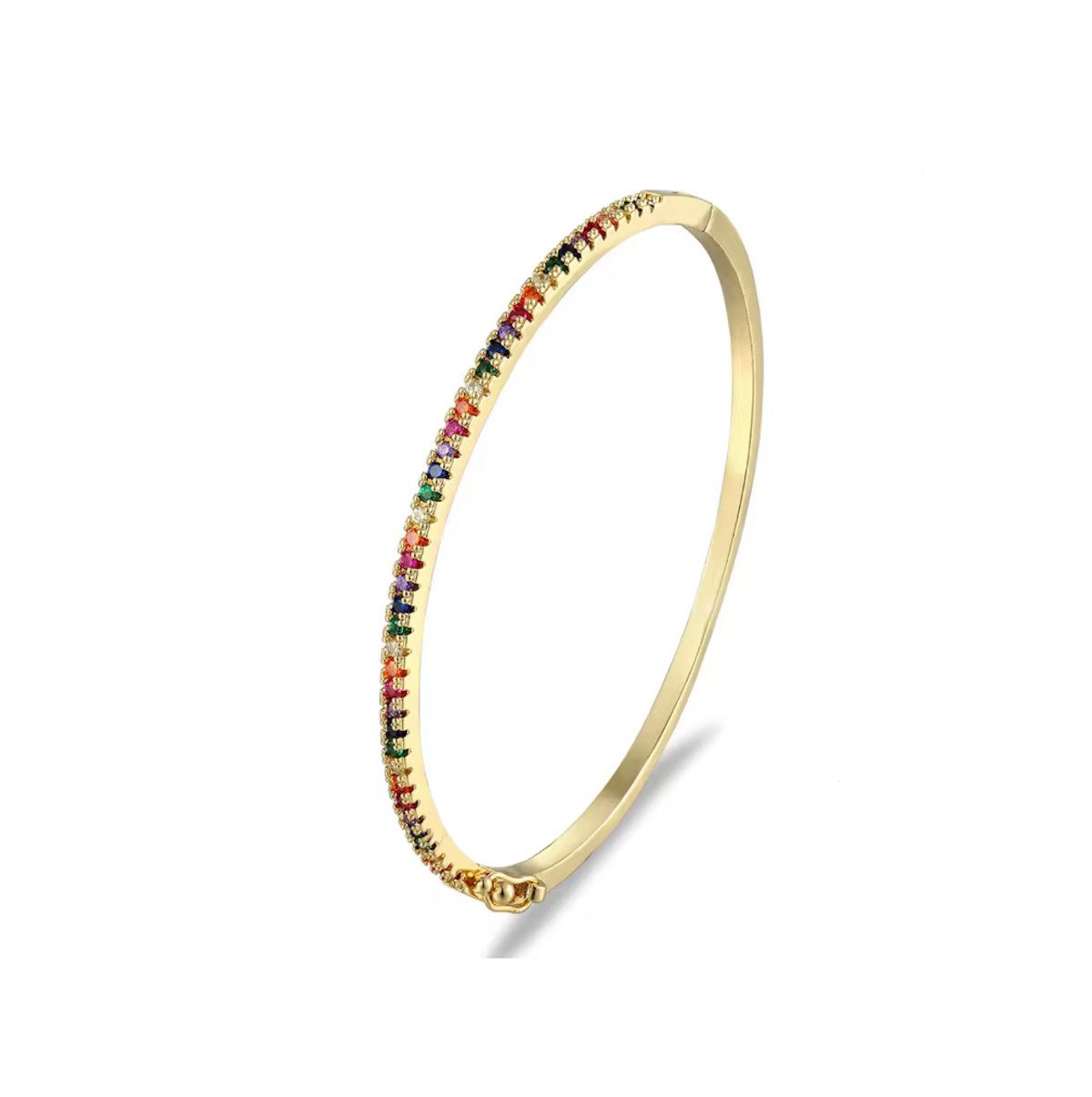 Der Arco Armreif bringt die Farben des Regenbogens an dein Handgelenk. Gefertigt aus vergoldetem Kupfer und rundum mit leuchtenden, bunten Zirkonia-Steinen besetzt, ist Arco das perfekte Statement-Piece für alle, die Farbe lieben. Das filigrane Design sorgt für einen modernen, femininen Look – ob solo getragen oder im Layering-Style kombiniert.