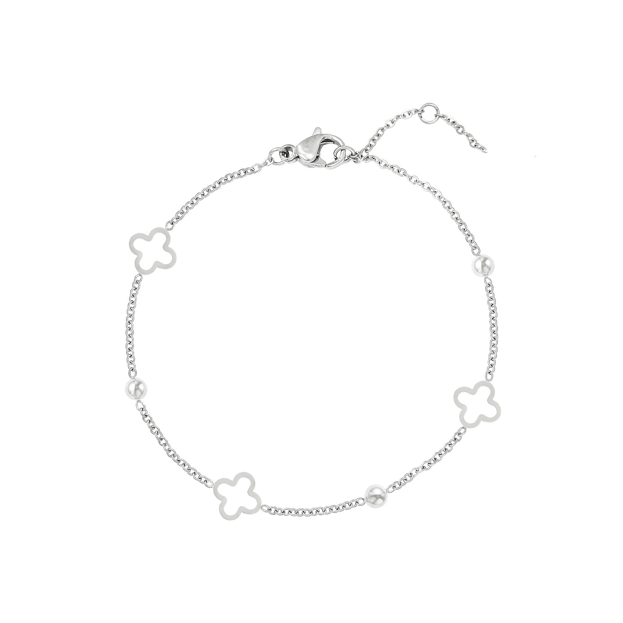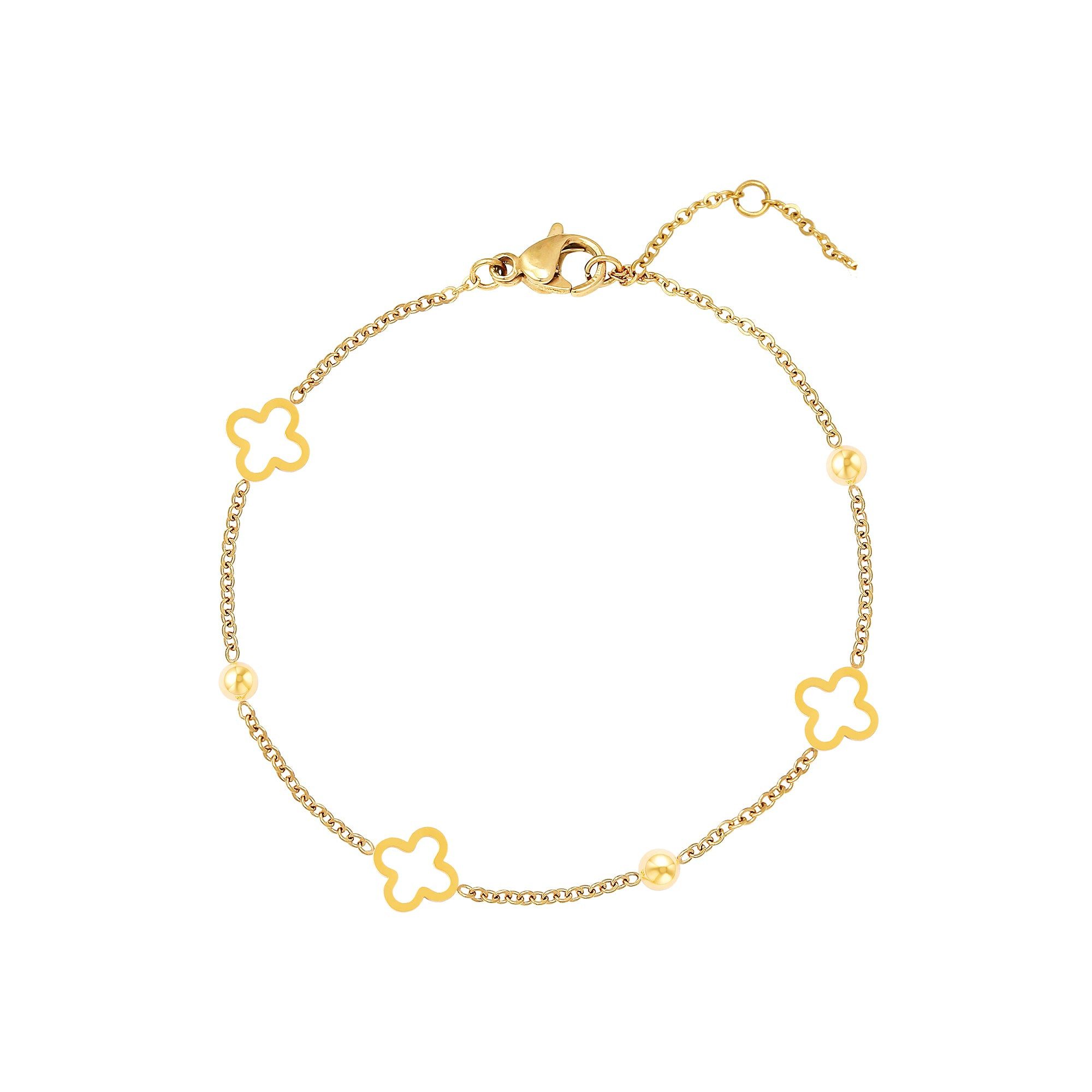 Ein zartes Armband mit offenen Kleeblättern und kleinen Kugeln. EBISU ist aus Edelstahl gefertigt und 14K vergoldet.