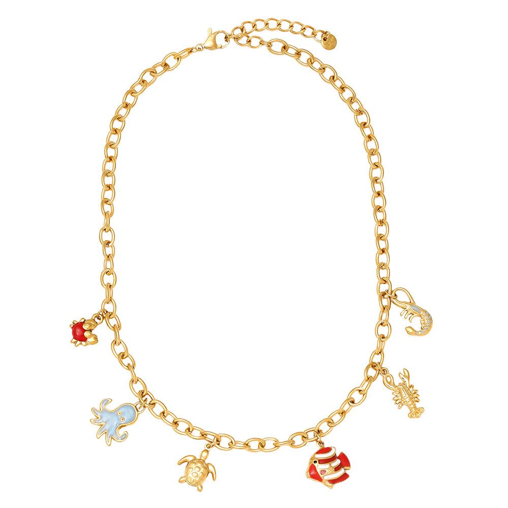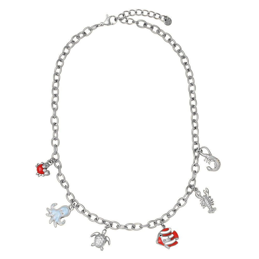 Die Tropical Sea Halskette bringt den Ozean an dein Dekolleté: verspielte Anhänger in Form von Schildkröte, Krabbe, Fisch, Oktopus, Hummer und Garnele hängen an einer robusten Gliederkette aus Edelstahl. Egal ob in gold- oder silberfarbener Ausführung – dieses Schmuckstück sorgt für Sommerfeeling und verleiht deinem Look eine frische, maritime Note.