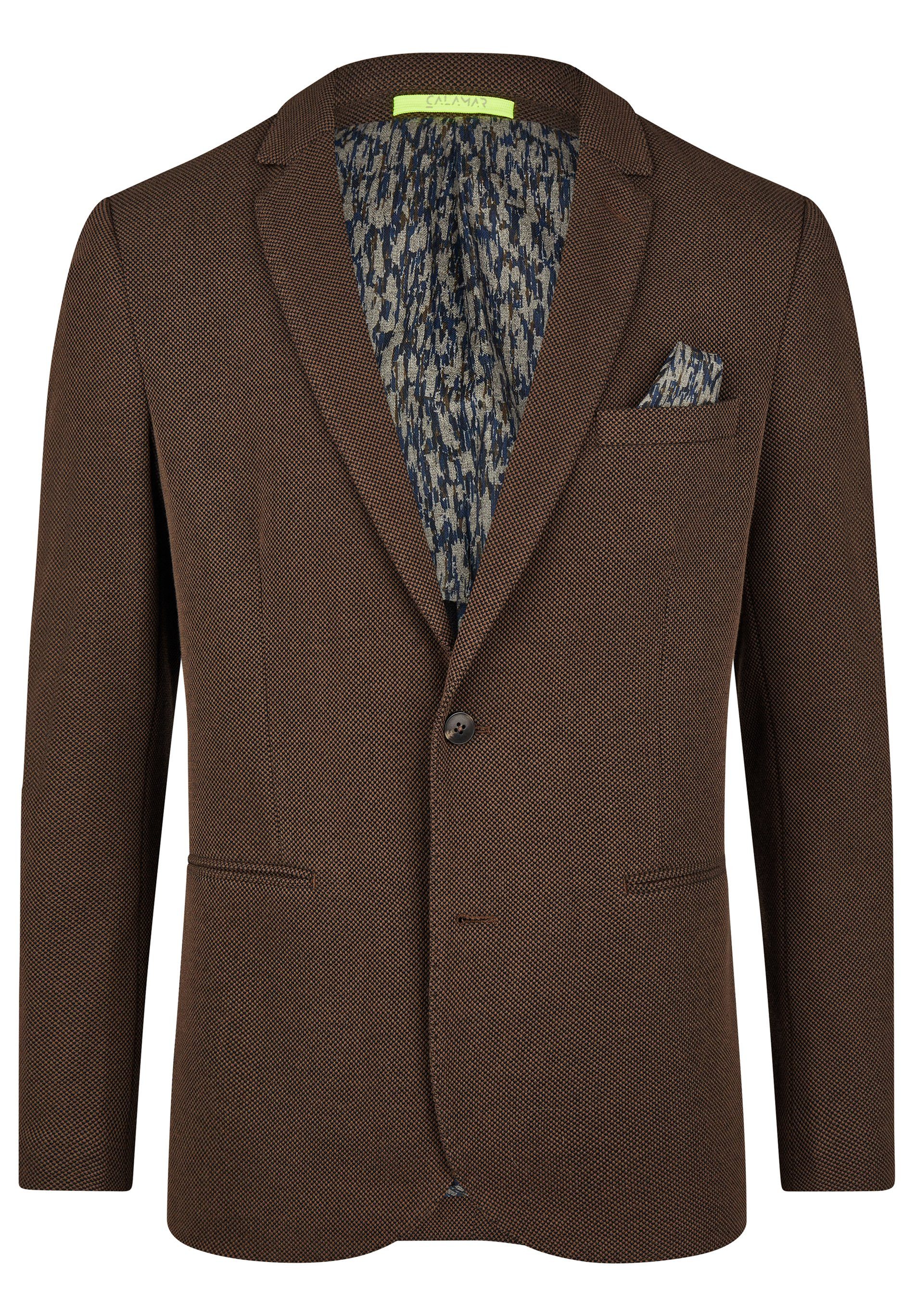Dieser sportlich-elegante Einreiher in attraktiver, urbaner Strickoptik ist wie geschaffen für Dich, egal ob Du das topaktuelle CALAMAR Sakko in Dein Business-Outfit integrierst oder ob Du es leger in der Freizeit trägst. Bedingt durch die leicht körperbetonte Regular fit Passform sehen Männer in dem trendigen Herrensakko einfach toll aus. Der untere der beiden Knöpfe bleibt am besten lässig geöffnet. Für eine gute Passform sorgt der Materialmix aus Polyester, Viscose und Elastan. Wertig und strapazierfähig erscheinen zudem die seitlichen Doppelpaspeltaschen, über die das CALAMAR Sakko verfügt. Mit Sicherheit wirst Du Dich auch über die praktischen Innentaschen freuen.