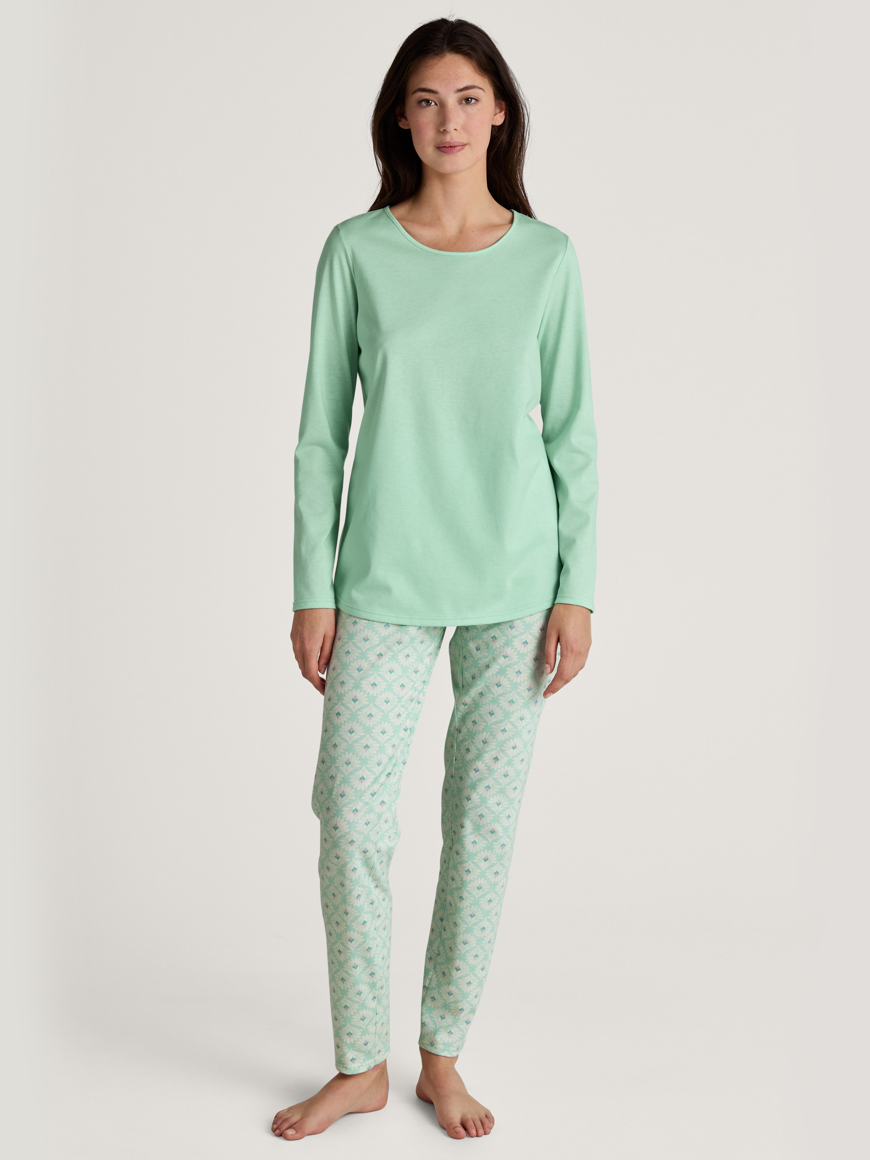 Endlich Me-Time: Einen kuscheligen Abend verheißt dieser zweiteilige Damen-Schlafanzug aus der Fruity Dreams Serie von CALIDA. Und für das richtige Gleichgewicht zwischen Gemütlichkeit und Style ist er bei normaler Leibhöhe lang geschnitten. Der Schlafanzug hat einen Rundhalsausschnitt. Seine Ärmel sind lang. Die Hosenbeine sind gerade geschnitten. Den oberen Abschluss bildet ein elastischer Bund mit Gummizug.