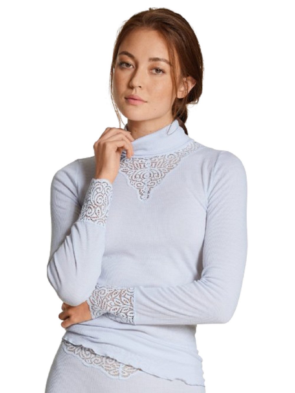 Calida Wolle/Seide Langarmtop 15659 arctic ice Wenn doch nur alles so weich und anpassungsfreudig wäre wie das SILKY WOOL Langarmshirt von CALIDA! Das Leben wäre der reinste Spaziergang. In diesem Untershirt mit zarter Spitze am Rollkragen und an den Ärmelabschlüssen darf sich Frau ganz Frau fühlen und muss an kühlen Tagen dennoch nicht frieren. Die edle Merino-Seidenmischung besticht durch einen natürlichen Wärmeeffekt bei ultraleichter und anschmiegsamer Struktur. Materialzusammensetzung: 70% Schurwolle, 30% Seide