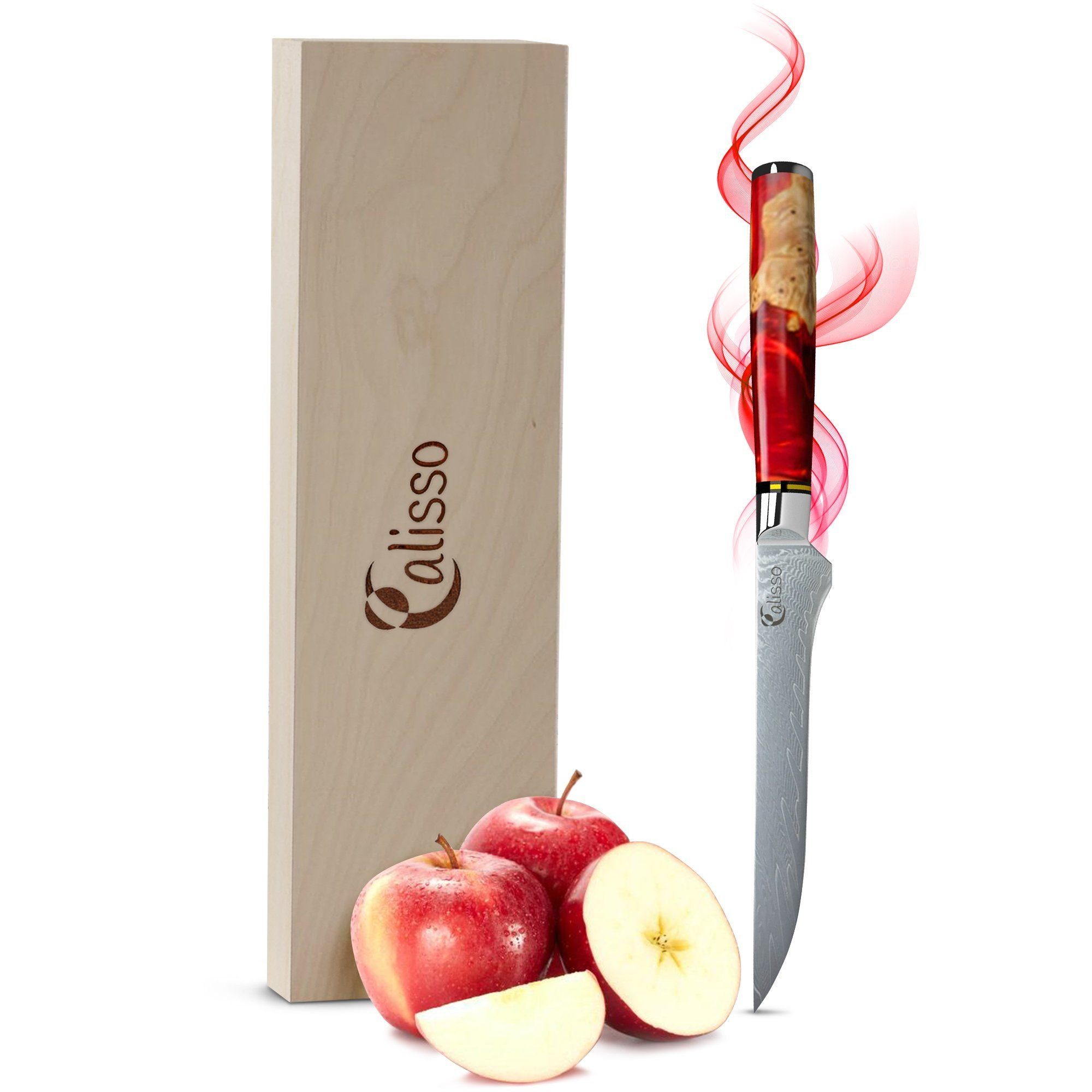 Hauptsächlich wird das Filetiermesser für das Filetieren von Fisch verwendet. Es kann jedoch auch für die Zubereitung von Fleisch genutzt werden, da sich durch die scharfe und dünne Klinge Sehnen und Haut sehr leicht entfernen und das Fleisch in dünne Scheiben schneiden lässt. Da die Klinge sehr scharf ist empfehlen wir die Benutzung eines Filetierhandschuhs. Produktdetails Unsere Damastmesser bestehen aus verschieden harten Lagen Stahl und Eisen, welche zu 67 Schichten zusammengeschmiedet wurden. Dadurch sind unsere Damastmesser äußerst flexibel, stabil und können besonders scharf geschliffen werden und bleiben lange scharf. Material Klinge: 67 Lagen Damaskus Stahl, bestehend aus 66 Lagen 10Cr15CoMoV und 1 VG-10 Damaskus Stahlkern Material Griff: gefärbtes Harz, streng ausgewähltes Hartholz Härtegrad: 60 ± 2 HRC Unglaubliche Schärfe durch Schleifwinkel von 15° Der verwendete Stahl und eine gründliche Politur jeder Klinge führen zu guter Rostbeständigkeit. Der Griff ist in Rubinoptik angefertigt und für ausgezeichnete Kontrolle, Agilität und Komfort beim Schneiden entwickelt. Damit liegt das Messer auch über längere Arbeitsphasen in der Küche gut in der Hand. Achtung: Das Messer ist nicht zum Zerhacken von Knochen geeignet! Dimensionen Grifflänge: 117 mm Klingenlänge: 143 mm Messerlänge: 260 mm Höhe: 18 mm Breite: 1,6 mm Gewicht: 82 g Pflegehinweise Ein gutes Küchenmesser aus Damaskus-Stahl sollte gut gepflegt werden. Lesen Sie sich dafür gerne unsere Hinweise online unter https://calisso.de/pages/pflegehinweise durch.