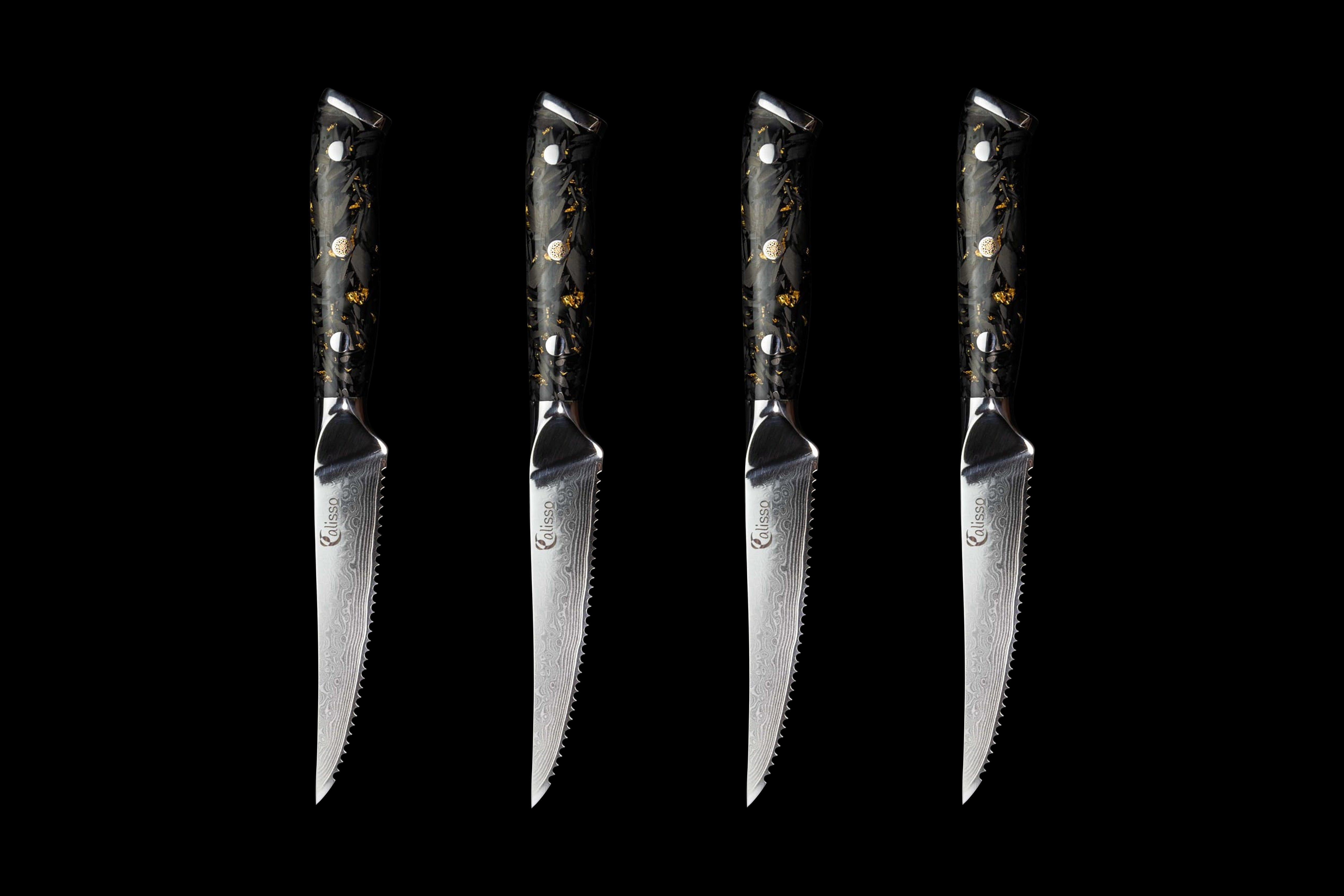 DER SPEZIALIST. Das Steakmesser glänzt durch hervorragende Schärfe, die vor allem bei gutem Steak sehr wichtig ist. Harte Untergründe, wie Keramik, sind für das Steakmesser keine Herausforderung, denn durch den Wellenschliff bleibt die Klinge auch dann sehr lange scharf. So wird auch Ihr über-über-nächster Steak-Abend ein tolles Highlight. Enthält: 4x Steakmesser DARIN GLÄNZT DAS STEAKMESSER: - präzises Arbeiten durch feine Klinge - Sehr Schnitthaltig durch Wellenschliff - Sehr handlich, auch für Anfänger leicht zu handhaben - Sehr einfach zu reinigen - Langlebig und stabil durch harten Stahlkern - Eine perfekte optische Ergänzung für Ihre Küche - Unglaubliche Schärfe durch Schleifwinkel von 15° PRODUKTDETAILS Calisso Damastmesser zeichnen sich durch überragende Qualität und ein unverkennbares Schnitterlebnis aus. - Material Klinge: 67 Lagen Damaskus Stahl - Material Griff: Carbonfasern mit Goldfolie eingeschlossen in Acryl - Härtegrad: 60 ± 2 HRC - Schliff: Wellenschliff, geeignet für Links- und Rechtshänder PRODUKTDIMENSIONEN - Gesamtlänge: 220 mm - Klingenlänge: 112 mm - Klingenhöhe: 21 mm - Gewicht: 0.448 kg PFLEGEHINWEISE Unsere Damastmesser bestehen aus verschieden harten Lagen Stahl und Eisen, welche zu 67 Schichten zusammengeschmiedet wurden. Dadurch sind unsere Damastmesser äußerst flexibel, stabil und können besonders scharf geschliffen werden und bleiben lange scharf. Ein gutes Küchenmesser aus Damaskus-Stahl sollte gut gepflegt werden. Lesen Sie sich dafür gerne unsere Hinweise online unter https://calisso.de/pages/pflegehinweise durch. Nicht spülmaschinengeeignet. Nicht zum Zerhacken von Knochen geeignet.