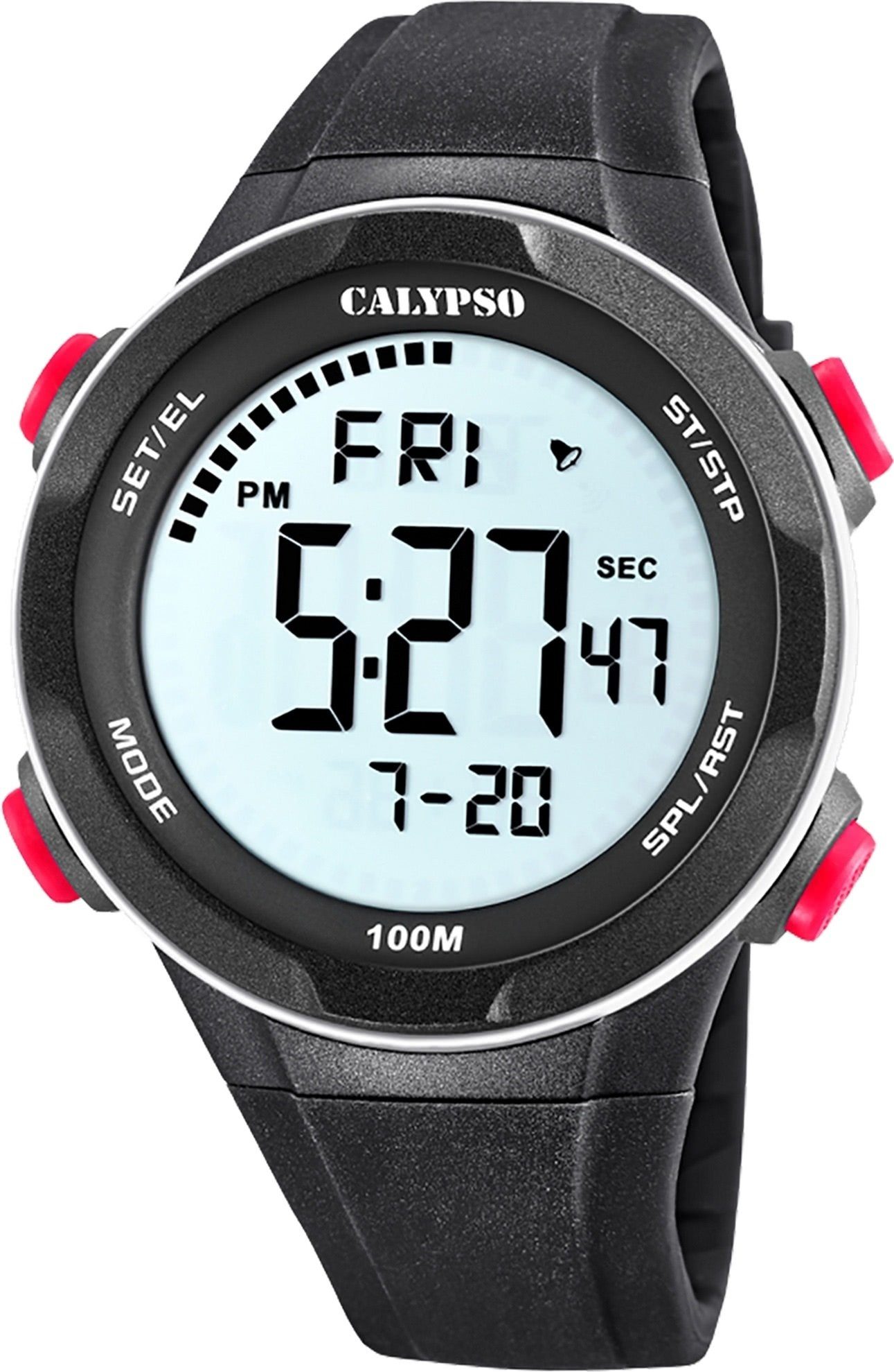 Die Casual Uhr der Marke Calypso hat ein schönes Armband aus Kunststoff in schwarz mit Dornschließe. Eine Uhr aus der Calypso Digital Kollektion für Herren Jugend in der Gehäusefarbe silber schwarz mit Quarzwerk. Die Digitaluhr mit Kunststoffglas hat ein Zifferblatt in der Farbe schwarz. Die Form der Uhr ist rund und das Gehäuse ist extra groß ca. 46mm.