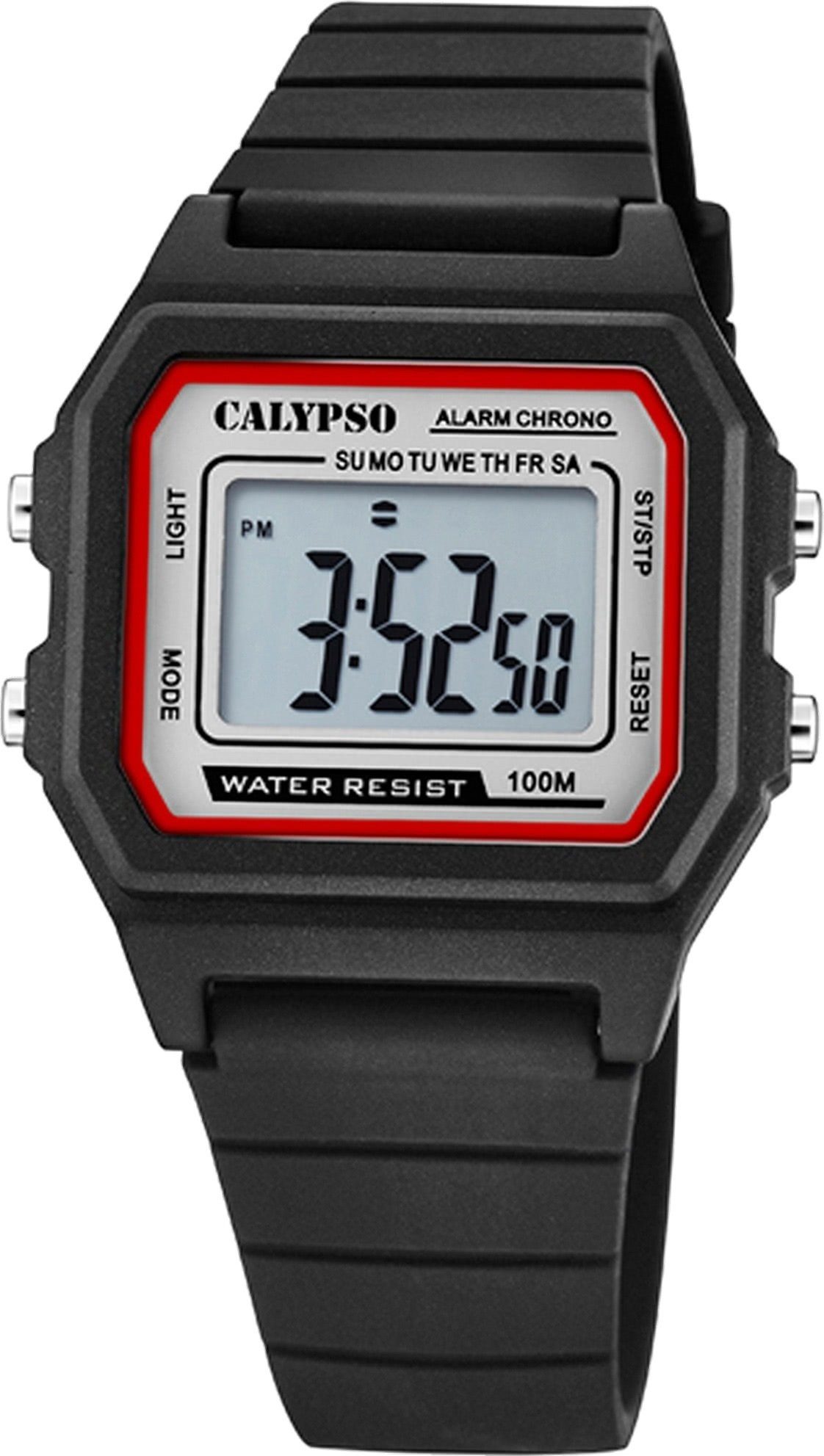 Die Sport Uhr der Marke Calypso hat ein schönes Armband aus Kunststoff in schwarz mit Dornschließe. Eine Uhr aus der Calypso Digital Kollektion für Herren in der Gehäusefarbe schwarz mit Quarzwerk. Die Digitaluhr mit Kunststoffglas hat ein Zifferblatt in der Farbe grau. Die Form der Uhr ist eckig und das Gehäuse ist mittelgroß ca. 37mm.