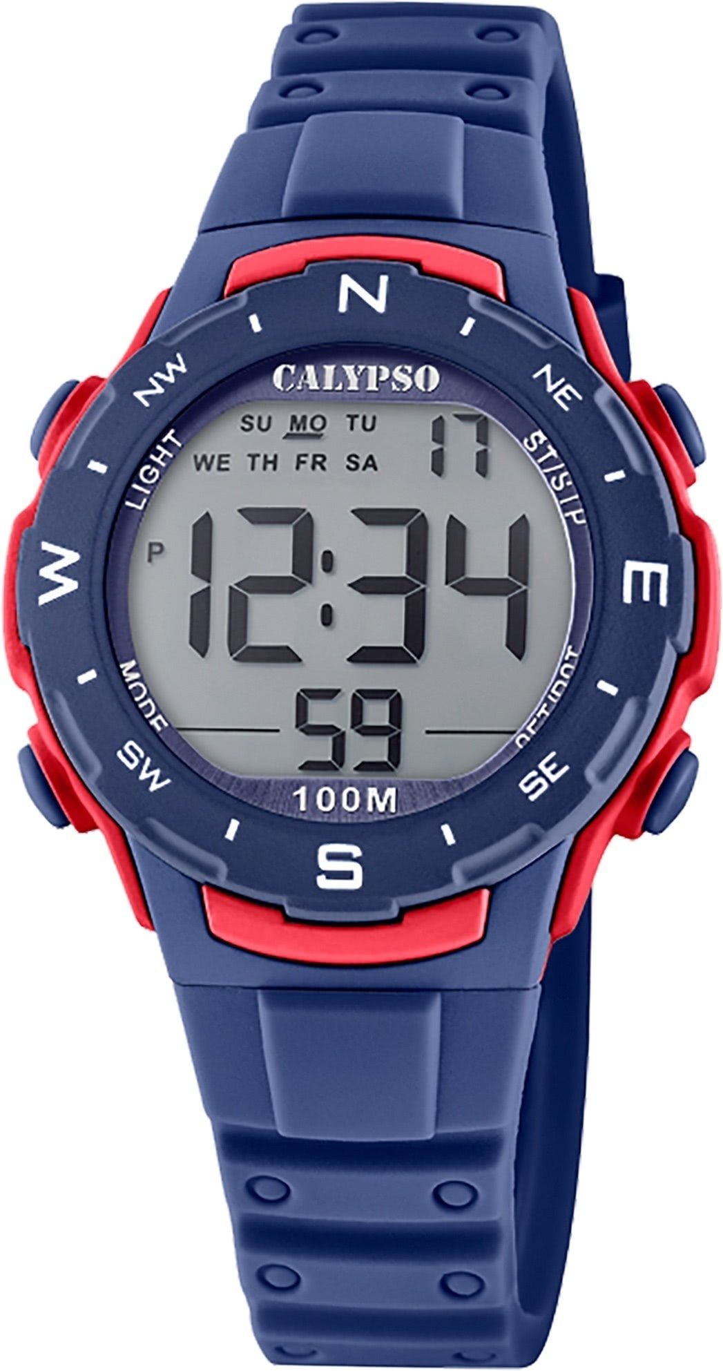 Die Sport Uhr der Marke Calypso hat ein schönes Armband aus Kunststoff in dunkelblau mit Dornschließe. Eine Uhr aus der Calypso Digital Kollektion für Damen Herren in der Gehäusefarbe dunkelblau rot mit Quarzwerk. Die Digitaluhr mit Kunststoffglas hat ein Zifferblatt in der Farbe grau. Die Form der Uhr ist rund und das Gehäuse ist mittelgroß ca. 35mm.