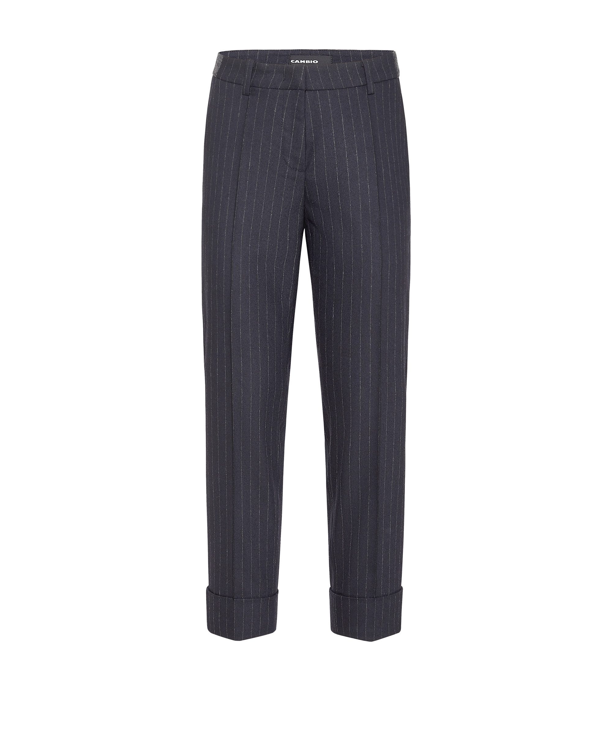 Entdecke die Eleganz der Hose Krystal, die perfekt für geschäftliche Anlässe und elegante Auftritte ist. Diese stilvolle Hose für Damen besticht durch ihr gestreiftes Design und die 7/8 Длина, die Deinem Look eine moderne Note verleiht. Mit ihrer mittelhohen Taille sorgt die Hose für eine schmeichelhafte Silhouette und bietet gleichzeitig hohen Tragekomfort. Die leicht zulaufenden Beine und die Bügelfalte unterstreichen das zeitlose und zugleich modische Design, das sich ideal für Business Casual Outfits eignet.Die Hose Krystal von Cambio kombiniert hochwertige Materialien und optimale Passform. Das Obermaterial besteht aus einer sorgfältig ausgewählten Mischung: 39% Wolle, 33% Polyester, 14% Viskose, 13% Polyamid und 1% Elasthan. Diese Materialkombination sorgt nicht nur für ein angenehmes Tragegefühl, sondern auch für Langlebigkeit und Formbeständigkeit. Die verkürzte Длина ноги der Hose ist ein modernes Detail, das Deinen Look stilvoll abrundet und sich perfekt mit verschiedenen Schuhen kombinieren lässt.Die Hose ist vielseitig einsetzbar und eignet sich hervorragend für Business Meetings, elegante Abendveranstaltungen oder auch für den gehobenen Freizeitlook. Kombiniere sie mit einer schicken Bluse oder einem eleganten Blazer, um das Beste aus Deinem Outfit herauszuholen. Die klassische Bügelfalte und das gestreifte Design verleihen der Hose eine raffinierte Note und machen sie zu einem unverzichtbaren Bestandteil Deiner Garderobe.Für ein professionelles und zugleich modisches Auftreten ist die Hose Krystal die ideale Wahl. Die Kombination aus Komfort und Stil macht sie zur perfekten Ergänzung für jede modebewusste Frau. Egal ob im Büro oder bei festlichen Anlässen, mit dieser Hose bist Du immer gut gekleidet. Erlebe den Unterschied, den hochwertige Materialien und durchdachtes Design machen können, und genieße die Vielseitigkeit und Eleganz dieser besonderen Hose. Hose Krystal für Damen mit gestreiftem Design Materialmix: 39% Wolle, 33% Polyester, 14% Viskose, 13% Polyamid, 1% Elasthan Leicht zulaufendes, verkürztes Bein mit 7/8 Длина Bügelfalte für einen eleganten Look Perfekt für Business Casual und elegante Anlässe