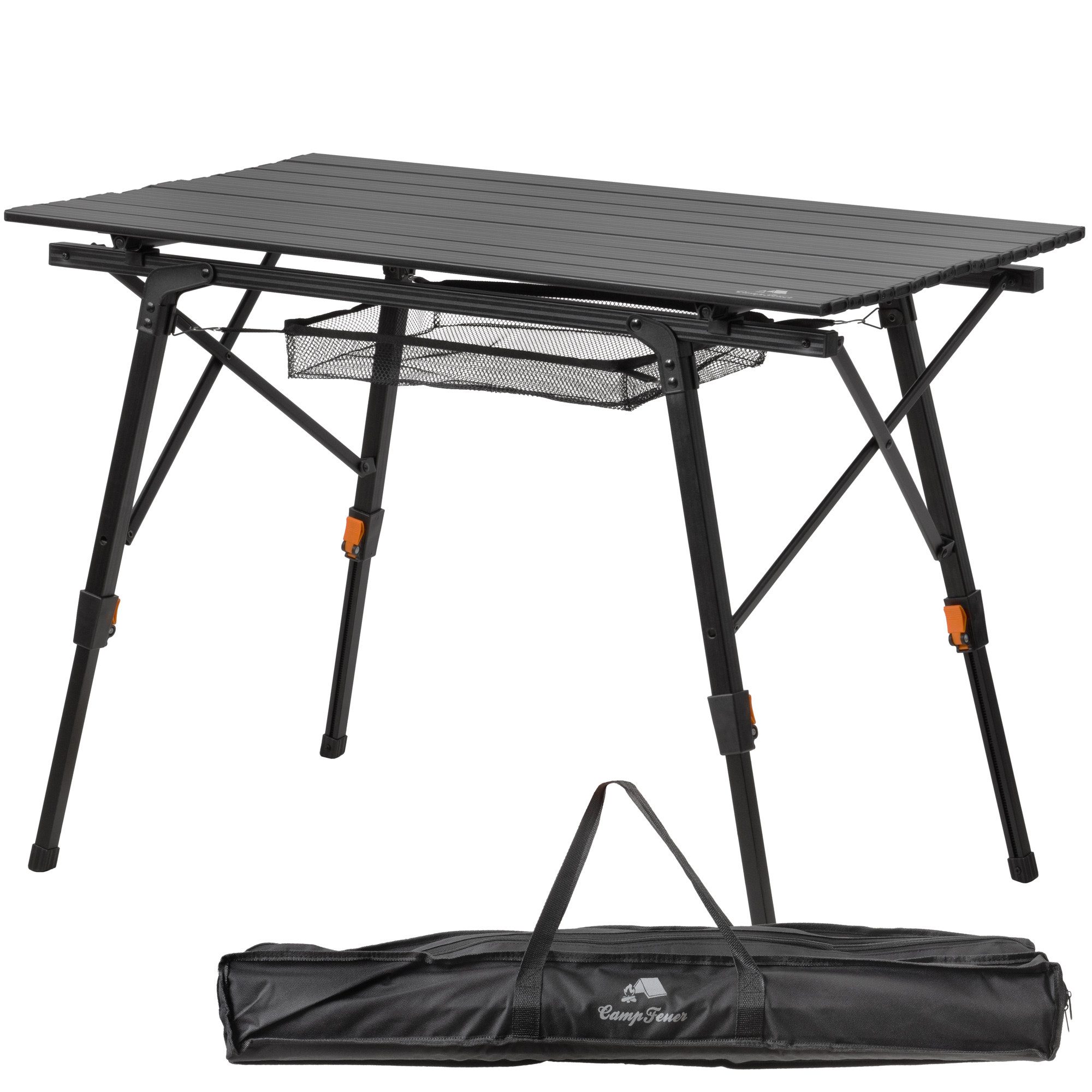 Highlights - Ideal geeignet für: Camping, Garten, Terrasse und Feiern - Размер (aufgestellt): (B) 90,5 x (T) 51,5 x (H) 45-65,5 cm - Packmaß: (B) 92 x (T) 20 x (H) 10 cm - Netztasche: (B) 36,5 x (T) 27,5 x (H) 5 cm - Gewicht: 3,85 kg - Traglast: bis zu 30 kg - Farbe: Schwarz - Material (Gestänge und Unterbau): Aluminium - Material (Tischplatte): Aluminium - Anti-Rutsch-Füße für sicheren Stand - Massive und stabile Ausführung - Hohe Belastbarkeit - Klappbar und höhenverstellbar - Inklusive praktischer Trage