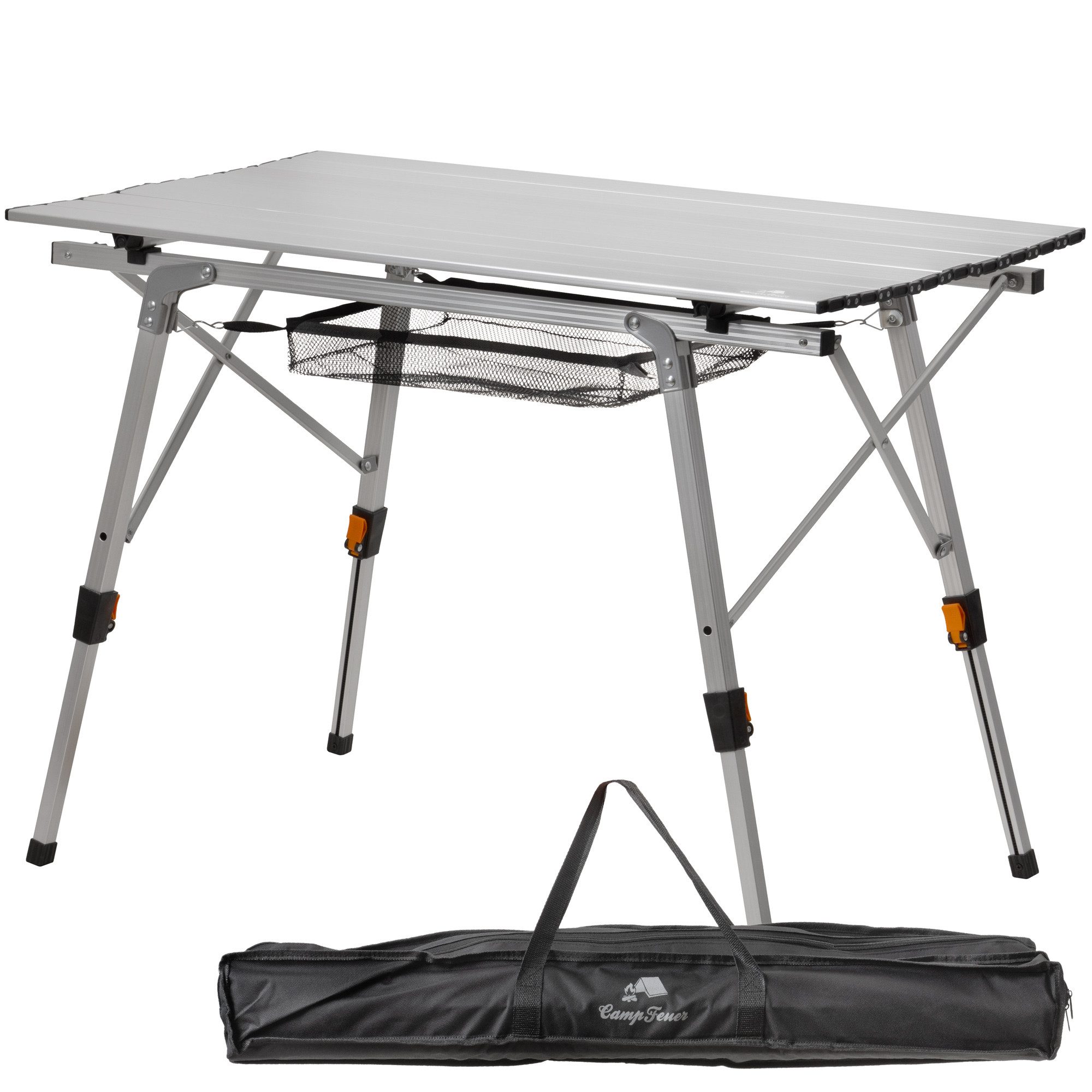 Highlights - Ideal geeignet für: Camping, Garten, Terrasse und Feiern - Размер (aufgestellt): (B) 90,5 x (T) 51,5 x (H) 45-65,5 cm - Packmaß: (B) 92 x (T) 20 x (H) 10 cm - Netztasche: (B) 36,5 x (T) 27,5 x (H) 5 cm - Gewicht: 3,85 kg - Traglast: bis zu 30 kg - Farbe: Silber - Material (Gestänge und Unterbau): Aluminium - Material (Tischplatte): Aluminium - Anti-Rutsch-Füße für sicheren Stand - Massive und stabile Ausführung - Hohe Belastbarkeit - Klappbar und höhenverstellbar - Inklusive praktischer Trageta