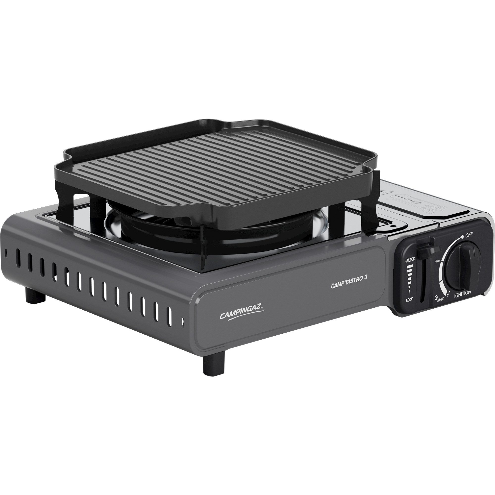 2,2kW Einflammkocher, Modell 2025 Der Einflammkocher Camp'Bistro 3 mit Grillplatte eignet sich hervorragend für Tagesausflüge, Picknicks, Camping und viele andere Gelegenheiten. Das neue 2025er Modell verfügt über ein kompakteres und leichteres Design als der Vorgänger, sowie einen überarbeiteten Topfträger, welcher in der Handhabung noch einfacher und komfortabler ist. Die Piezozündung und der stufenlos verstellbare Regler machen die Bedienung und die Regelung sehr komfortabel. Betrieben wird der Kocher mit der Campingaz Kartusche CP 250, die praktisch in dem seitlichen Fach des Kochers verstaut und angeschlossen werden kann. Außerdem verfügt der Camp'Bistro 3 über die Kartuschensicherung “Safety-Lock”, durch den Hebel neben dem Gasregler kann die Gaszuführung schnell unterbrochen bzw. wiederhergestellt werden. Zum einfachen Transport und zur sicheren Lagerung wird der Kocher in einem Kunststoffkoffer geliefert.