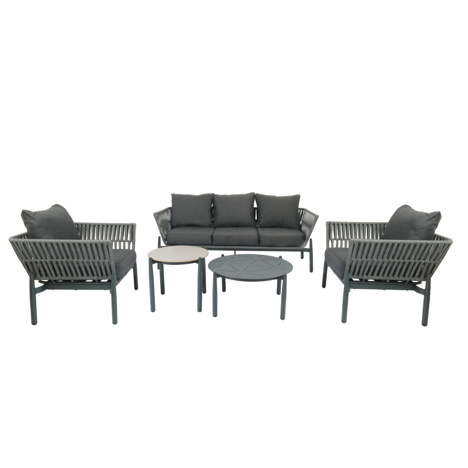 Set beinhaltet | Set besteht aus 3-Sitzer Sofa, 2 Sesseln, 2 Tischen und Sitzpolstern |