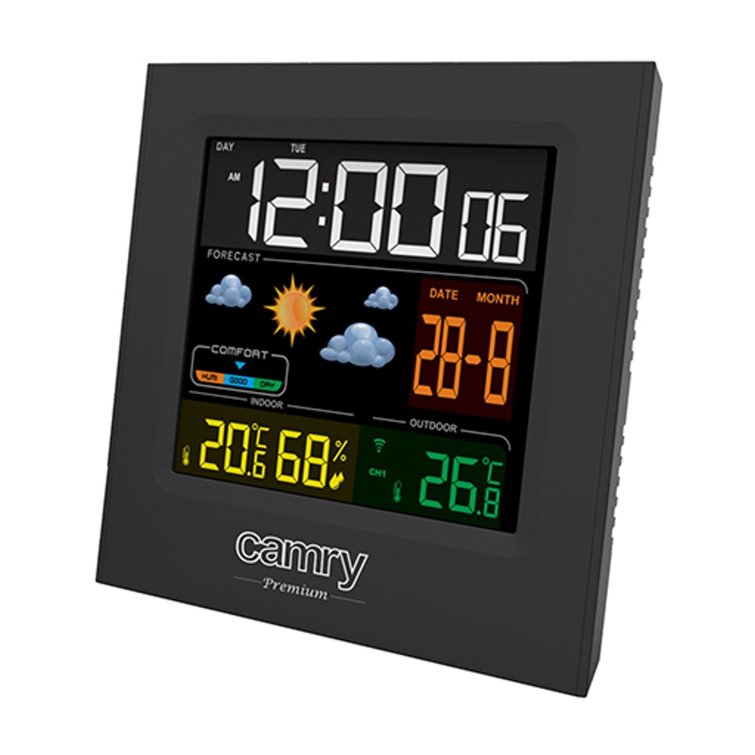 Die Wetterstation verfügt über eine Anzeige welcher die Temperatur im Raum- sowie im Außenbereich als auch Luftfeuchtigkeit angibt. Im Set befindet sich ein Sensor für die Messung der Außentemperaturwerte. Das schwarze Gehäuse und das bunte Display tragen zum bequemen Lesen der Werte sogar am Abend oder in der Nacht bei. Außerdem verfügt die Wetterstation über Funktionen wie Wettervorhersage, eine Uhr, Wecker und sowie die Datumsanzeige.