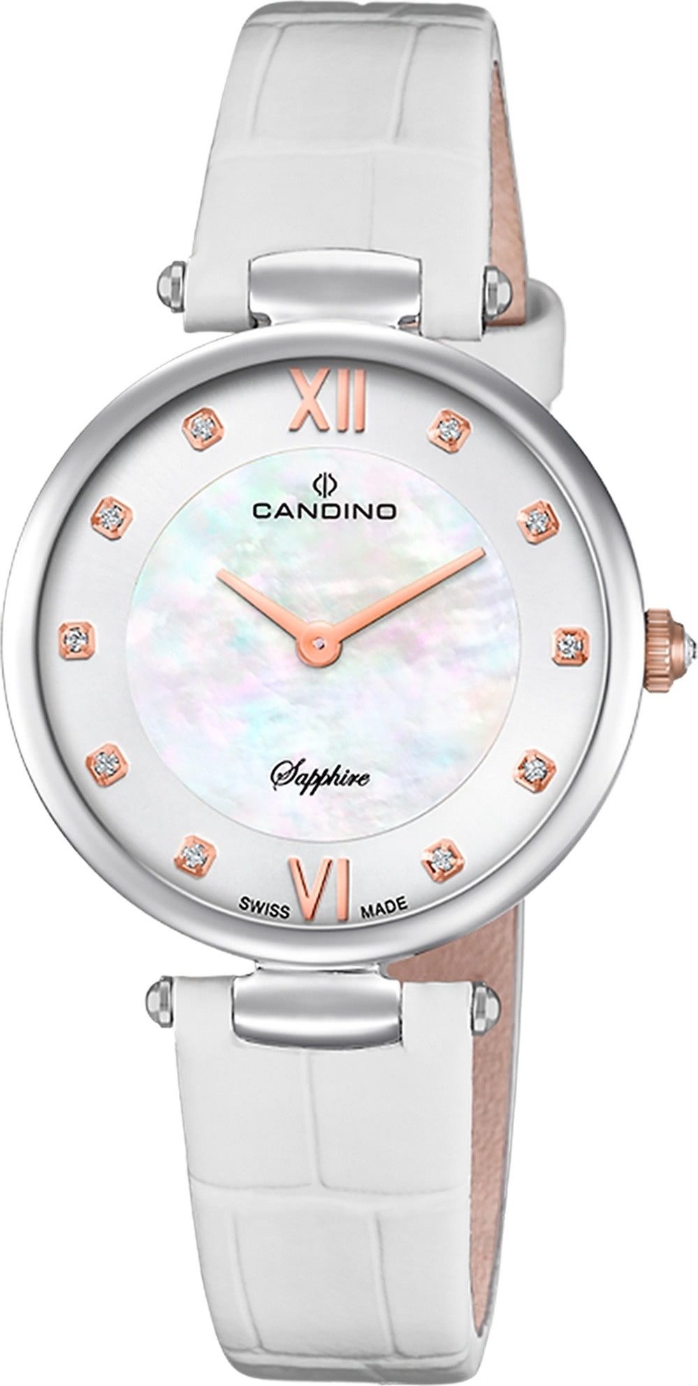 Diese schöne Uhr der Marke Candino hat ein Armband aus Leder in weiß mit Dornschließe. Dieser besondere Zeitmesser für Damen aus der Candino Elegance Kollektion hat die Gehäusefarbe silber und ist mit einen Quarzwerk ausgestattet. Die Analoguhr mit Saphirglas hat ein Zifferblatt in der Farbe weiß und die Gehäusegröße ist klein ca. 30mm.
