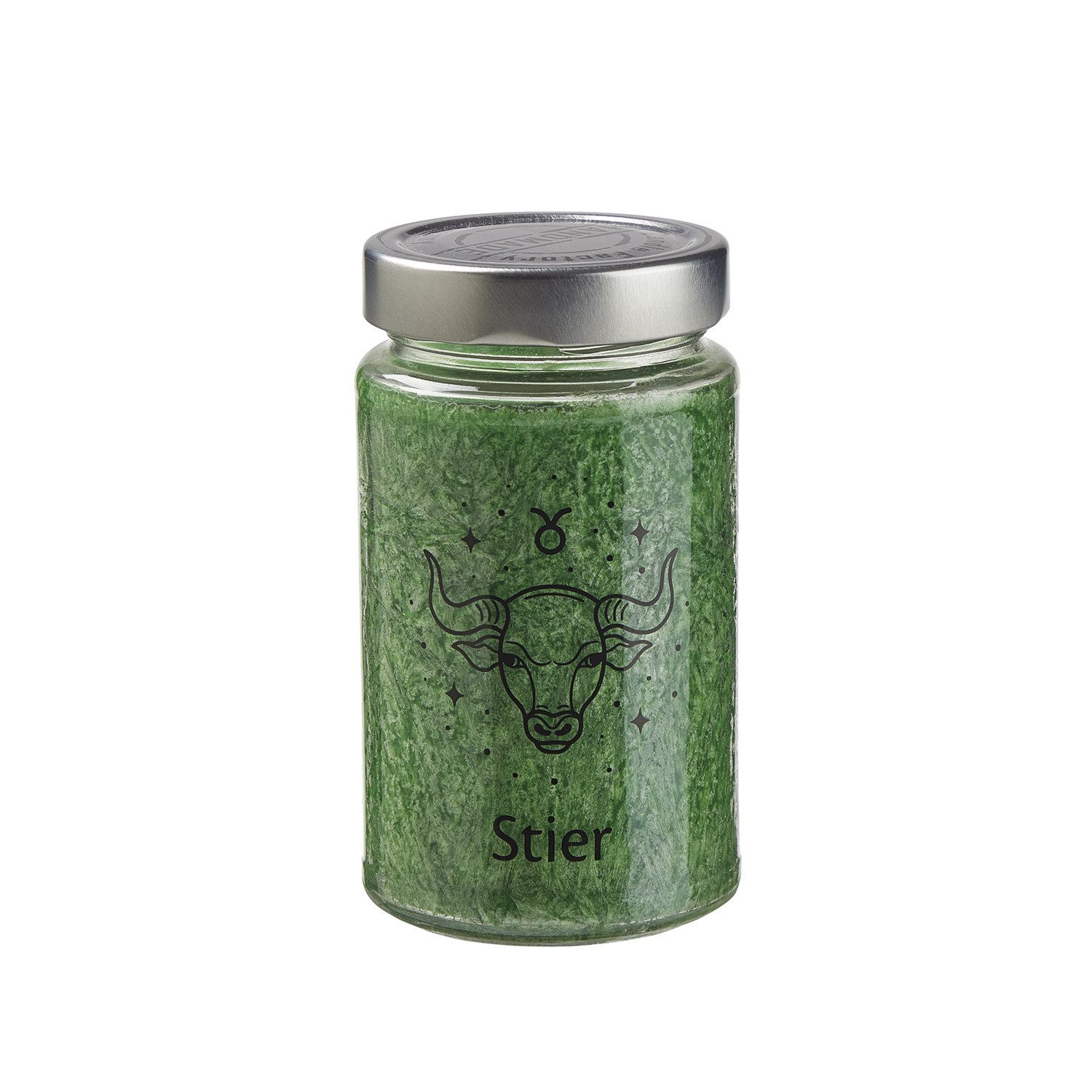 Menschen aus dem Sternzeichen Stier verstehen es, die angenehmen Seiten des Lebens in den Blickpunkt zu stellen und lieben alles, was mit Kunst, Musik und Gesang zu tun hat. Ihr künstlerisches Talent ist gepaart mit gesundem Menschenverstand und Realitätssinn. Stier-Menschen sind auf Sicherheit bedacht und bevorzugen das Vertraute, Gewohnte. Sie sammeln gern schöne Dinge. Ihre Vorhaben gehen sie mit Gründlichkeit und Ausdauer an. Was für ein wundervolles Grün! Darüber wird sich der Stier freuen, ist doch Grün seine liebste Farbe. Es symbolisiert das Gedeihen der Natur im Frühling und steht symbolisch für Freude und Herzenswärme. In dieser Duftkerze wird dies zudem von den lieblichen Düften von Rosenblüte und Pfirsich untermalt. 100 % Stearin, Schraubglas, H. 13 cm, Ø 7 cm. Brenndauer 60 Std.