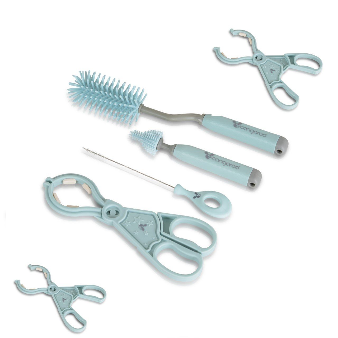 Das Babyflaschenreinigungsbürsten-Set von Cangaroo ist der ideale Begleiter für die gesamte Zeit der Flaschennahrung. Mit dieser Reinigungsbürste lassen sich die Trinkflaschen schnell und gründlich reinigen. Der Trinkflaschen- und Saugerreiniger liegt einfach in der Hand und benötigt nicht viel Platz in der Küche. Im Set enthalten sind zwei Bürsten, eine Zange sowie eine Handbürste für Strohhalme. Mit der Zange können sterilisierte Flaschen oder Zubehör entnommen werden.