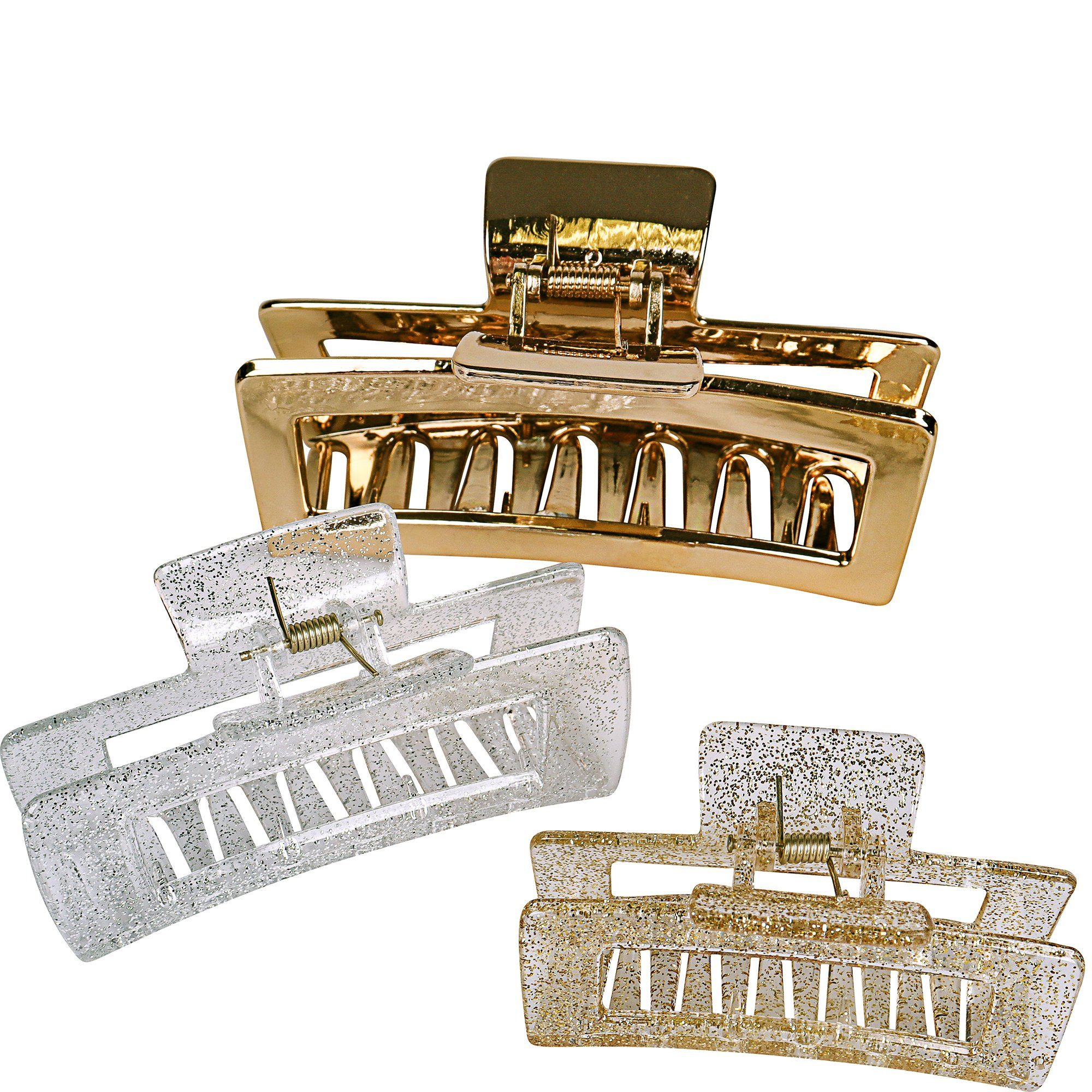 Haarklammer-Set - 3 Stück Verleihen Sie Ihrem Haarstyling einen Hauch von Glamour mit unserem Haarklammer-Set, bestehend aus drei beeindruckenden Stücken. Jede Haarklammer präsentiert sich mit einzigartigem Design und setzt optisch Akzente. 8,5 cm : mit Glitzerelementen (gold) 10,5 cm : mit Glitzerelementen (silber) 12,5 cm : mit Metallic-Finish Diese Haarklammern sind äußerst vielseitig einsetzbar und eignen sich für diverse Hairstylings. Ganz gleich, ob Sie einen festlichen Anlass, einen glamourösen Abendlook oder einen stilvollen Alltagsauftritt planen - dieses Set ist für alle Haarstärken geeignet und bietet optimalen Halt. Die Haarklammern halten das Haar geschickt an Ort und Stelle und setzen dabei auch optisch ein Highlight. Erleben Sie die perfekte Kombination von Funktionalität und ästhetischem Charme mit diesem ansprechenden Haarklammer-Set. Verleihen Sie Ihrem Haarstyling einen Hauch von Glamour mit unserem Haarklammer-Set, bestehend aus drei beeindruckenden Stücken. Jede Haarklammer präsentiert sich mit einzigartigem Design und setzt optisch Akzente. 8,5 cm : mit Glitzerelementen (gold) 10,5 cm : mit Glitzerelementen (silber) 12,5 cm : mit Metallic-Finish Diese Haarklammern sind äußerst vielseitig einsetzbar und eignen sich für diverse Hairstylings. Ganz gleich, ob Sie einen festlichen Anlass, einen glamourösen Abendlook oder einen stilvollen Alltagsauftritt planen - dieses Set ist für alle Haarstärken geeignet und bietet optimalen Halt. Die Haarklammern halten das Haar geschickt an Ort und Stelle und setzen dabei auch optisch ein Highlight. Erleben Sie die perfekte Kombination von Funktionalität und ästhetischem Charme mit diesem ansprechenden Haarklammer-Set.