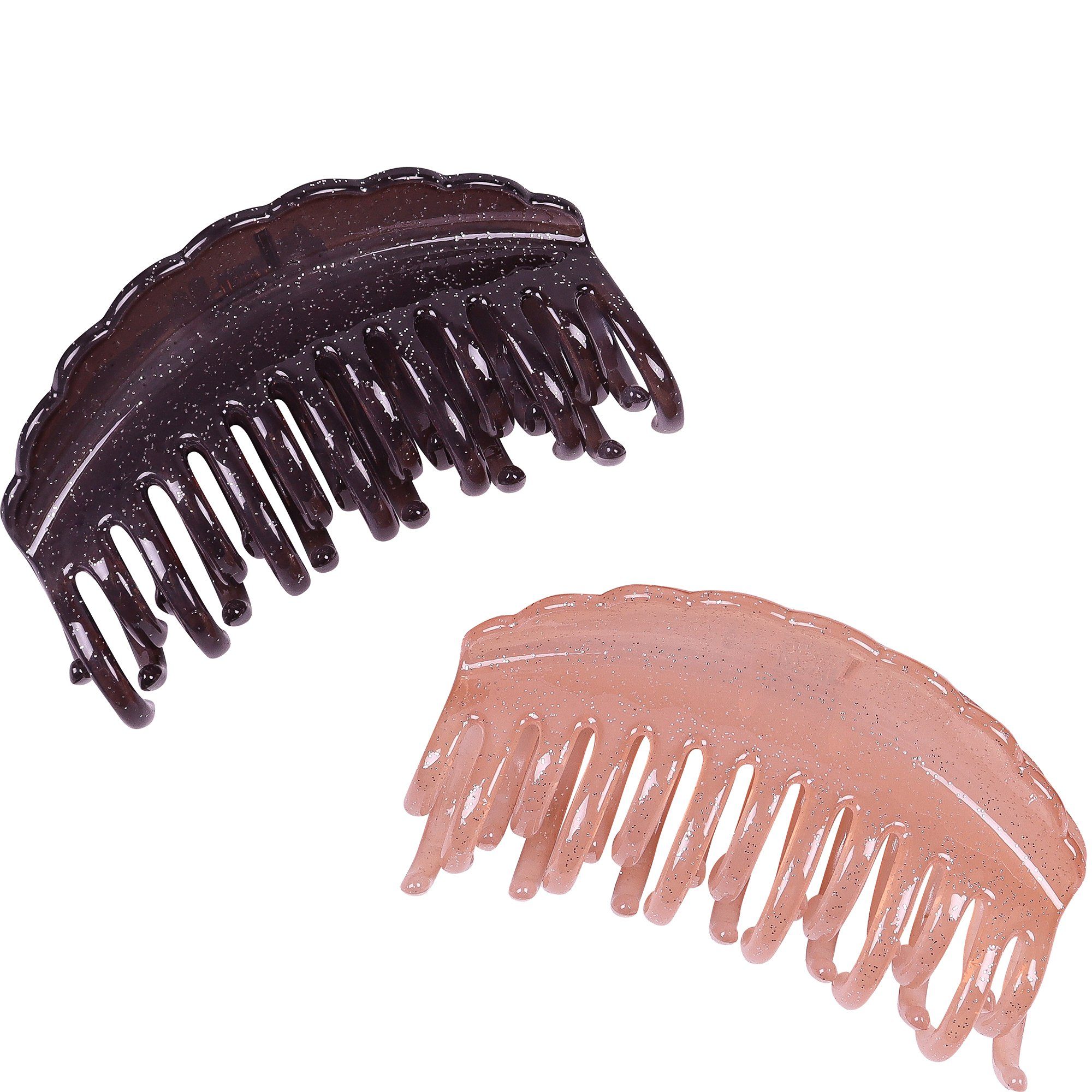 Entdecken Sie unser exquisites Haarklammer-Set mit einer bezaubernden Glitzer-Optik, das Ihrem Look eine subtile Eleganz verleiht. Die Haarklammern sind in den hinreißenden Farben Rosa und Aubergine gehalten und begeistern durch ihre zeitlose Schönheit. Mit einer Длина von etwa 9 cm sind diese Haarklammern nicht nur ein stilvolles Accessoire, sondern auch äußerst vielseitig einsetzbar, um unterschiedlichste Frisuren kunstvoll zu gestalten. Ganz gleich, ob Sie eine elegante Hochsteckfrisur, lockere Wellen oder einen klassischen Pferdeschwanz bevorzugen – diese Haarklammern sind die perfekte Ergänzung für jeden Stil. Die Haarklammern eignen sich für alle Haarstärken und gewährleisten einen zuverlässigen Halt, während sie gleichzeitig optisch als wahre Highlights brillieren. Setzen Sie mit diesen stilvollen Haarklammern ein modisches Statement und verleihen Sie Ihrem Haar einen Hauch von Glamour. Gönnen Sie sich dieses wundervolle Set und unterstreichen Sie Ihre individuelle Schönheit mit unseren glitzernden Haarklammern.